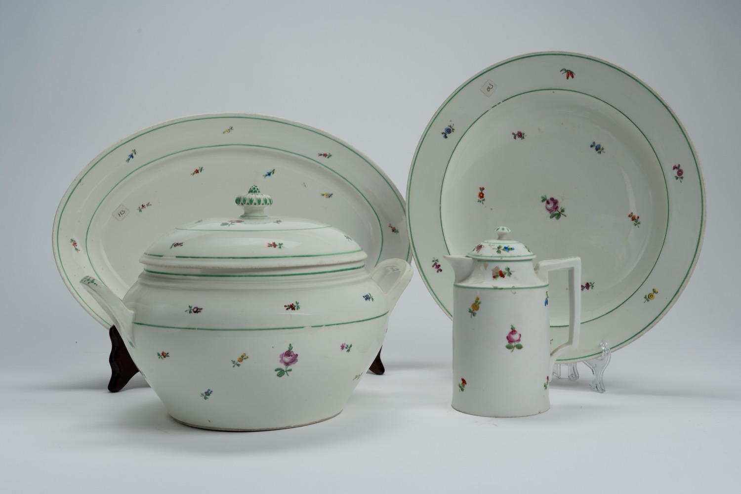 Lotto composto da una zuppiera biansata con coperchio e due piatti da portata in porcellana con decoro policromo a fiori sparsi e filettature in verde, Vienna, metà secolo XIX. Più una caffettiera di simil decoro ma di differente manifattura, Germania, Shlagenwal, prima metà secolo XIX