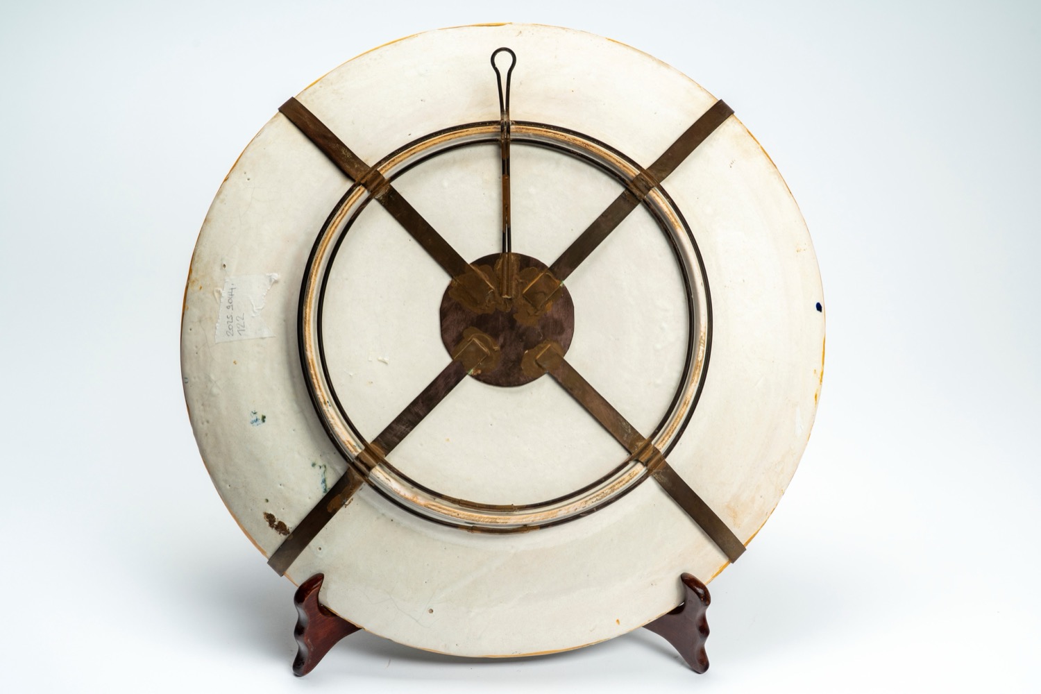 Piatto da parata in maiolica policroma a grottesche e istoriata con scena allegorica raffigurante la Storia con Mercurio e il Tempo. Manifattura del secolo XIX.
