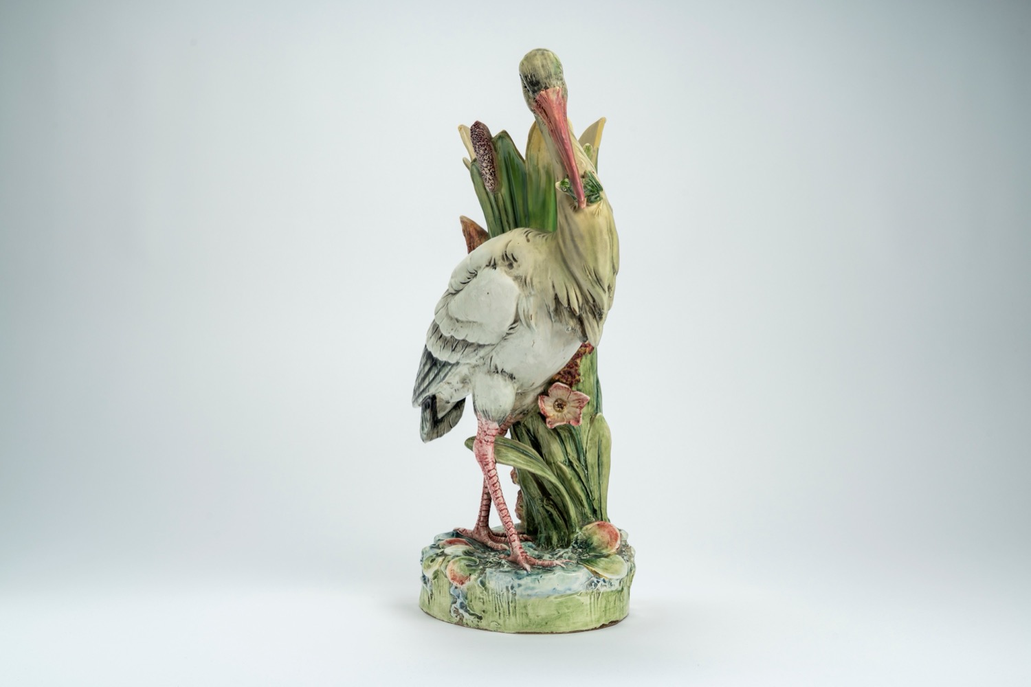 Grande vaso portafiori in ceramica policroma a forma di airone con ranocchia accanto a foglie e canne di palude. Francia, attribuito a Delphine Massier, Vallauris, circa 1890