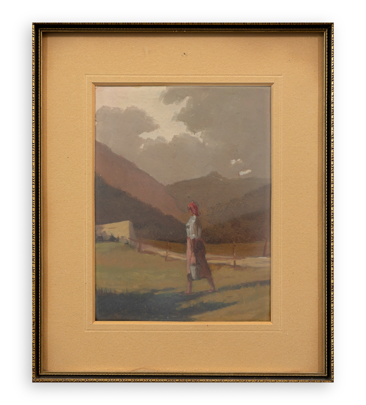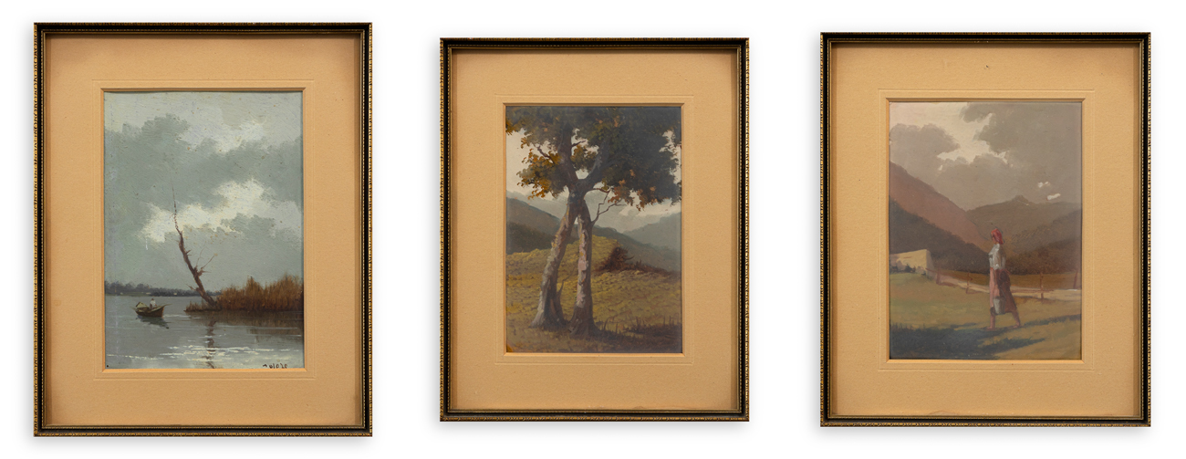 Lotto unico di 3 tempere su cartoncino raffiguranti scorci di paesaggio