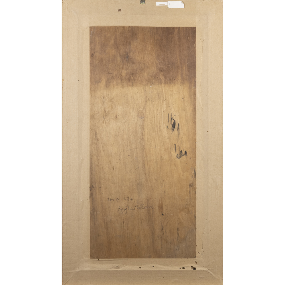"Donna con mazzolino di fiori"193474x37 cm.olio su tavola, firmato in basso a sinistra, firmata e datata sul retro, entro cornice