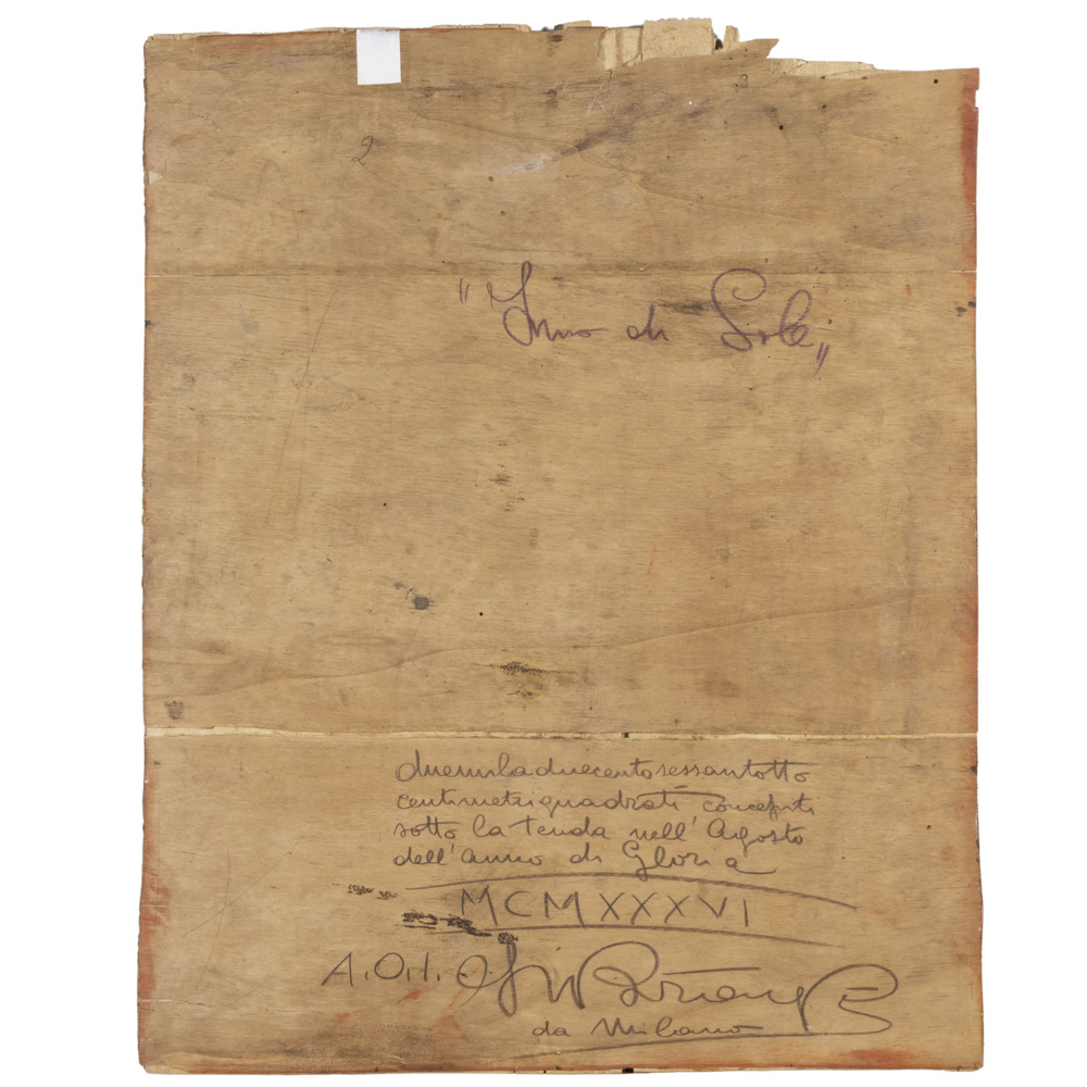 "Inno al sole"193652x42 cm.olio su tavoletta, firmato in basso a destra, firmato, datato e intitolato sul retro