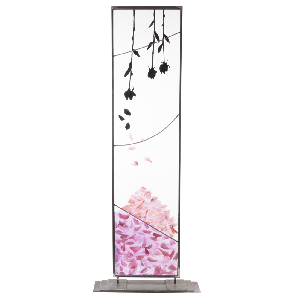 Vetrata di Lino Frongia2017210x51cm."Tre rose nere per gli amori recisi", vetro dipinto a mano a smalti, piombatura e cornice in ferro, base rettangolare, firma del maestro vetraio in basso a destra.