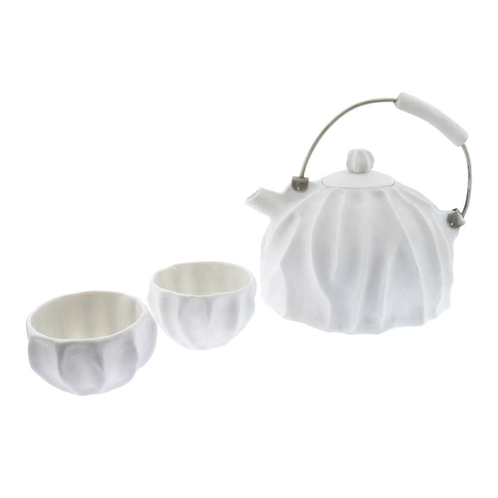 "Servizio da the serie Wings"h. massima 15 cm.in porcellana modellata a mano e invetriata, teiera con manico in argento, composta da: teiera e due tazzine, marchio sotto le basi