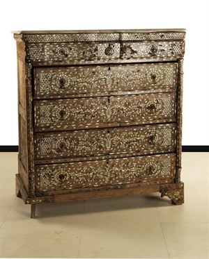 CASSETTONE ALTO Cassettone a 5 cassetti in legno intarsiato in madreperla e...