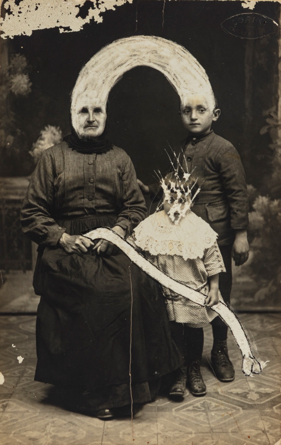 Stampa vintage alla gelatina ai sali d'argento su cartolina postale degli anni 1930, con interventi a tempera bianca e graffi