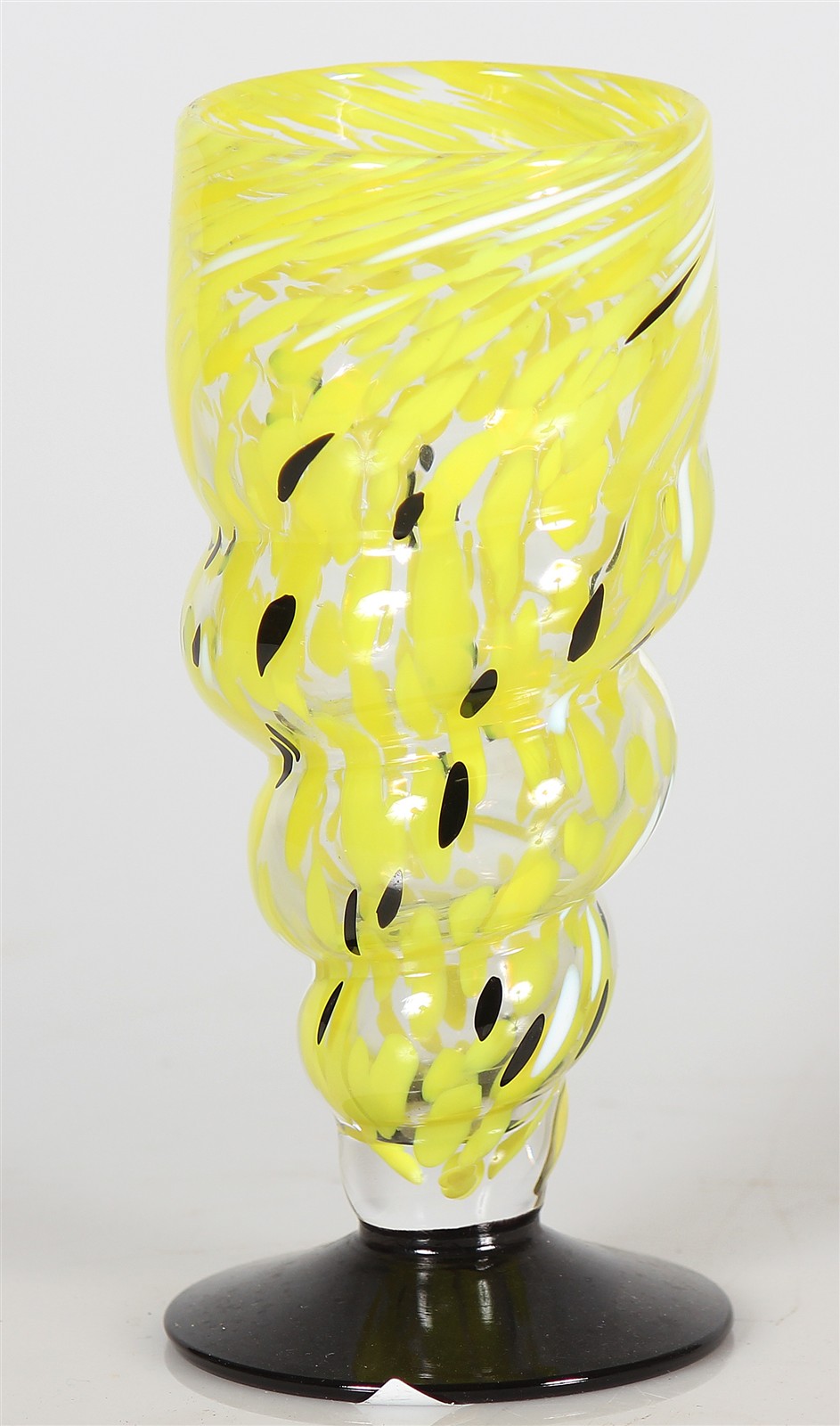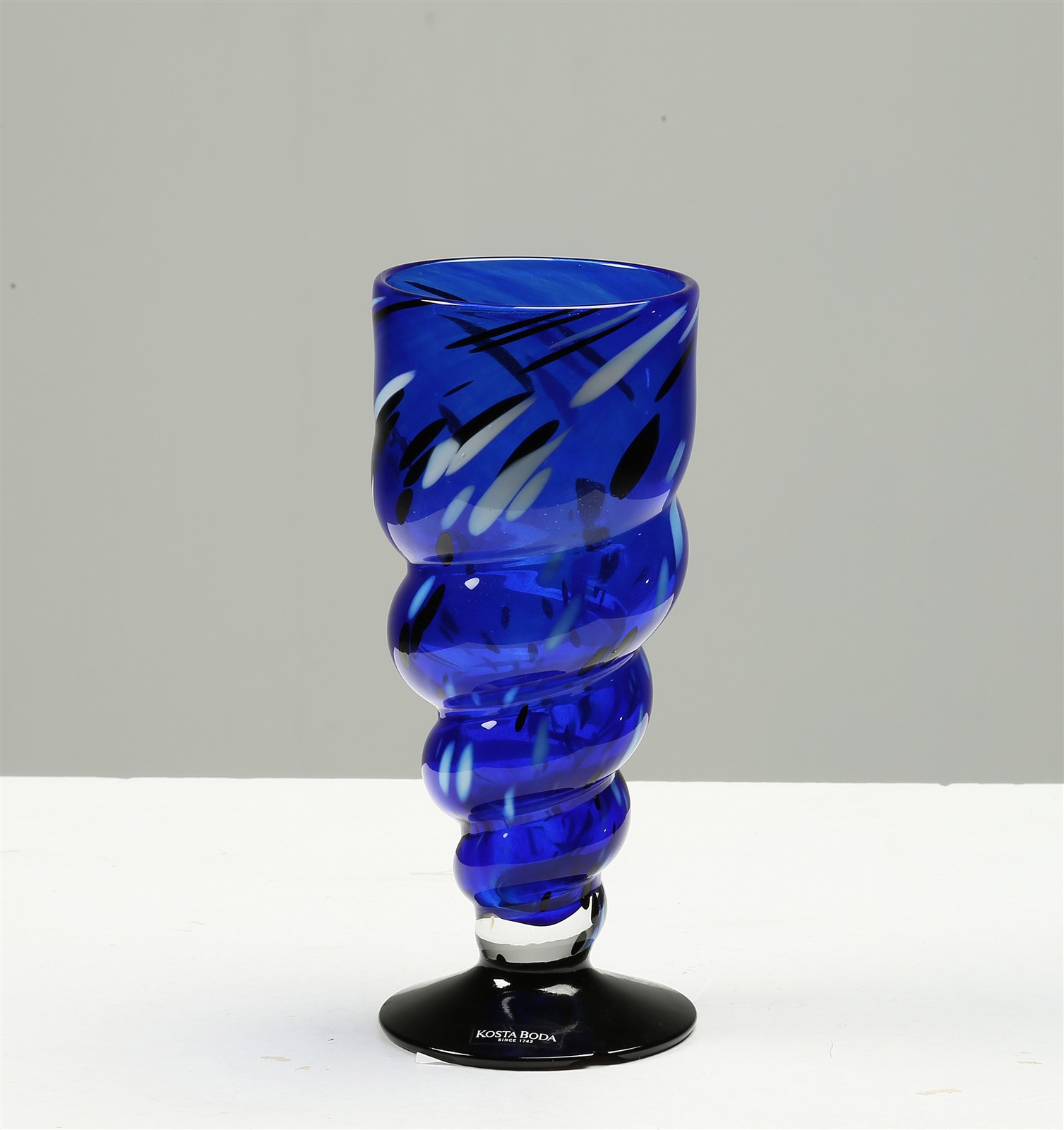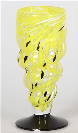 BODA KOSTA Lotto composto da n.2 bicchieri in vetro lavorazione gialle e blu. Vetro di Murano. Cm 8,00 x 18,00. 99/36, firma a graffio sotto la base. 99/37 ,firma a graffio sotto la base.