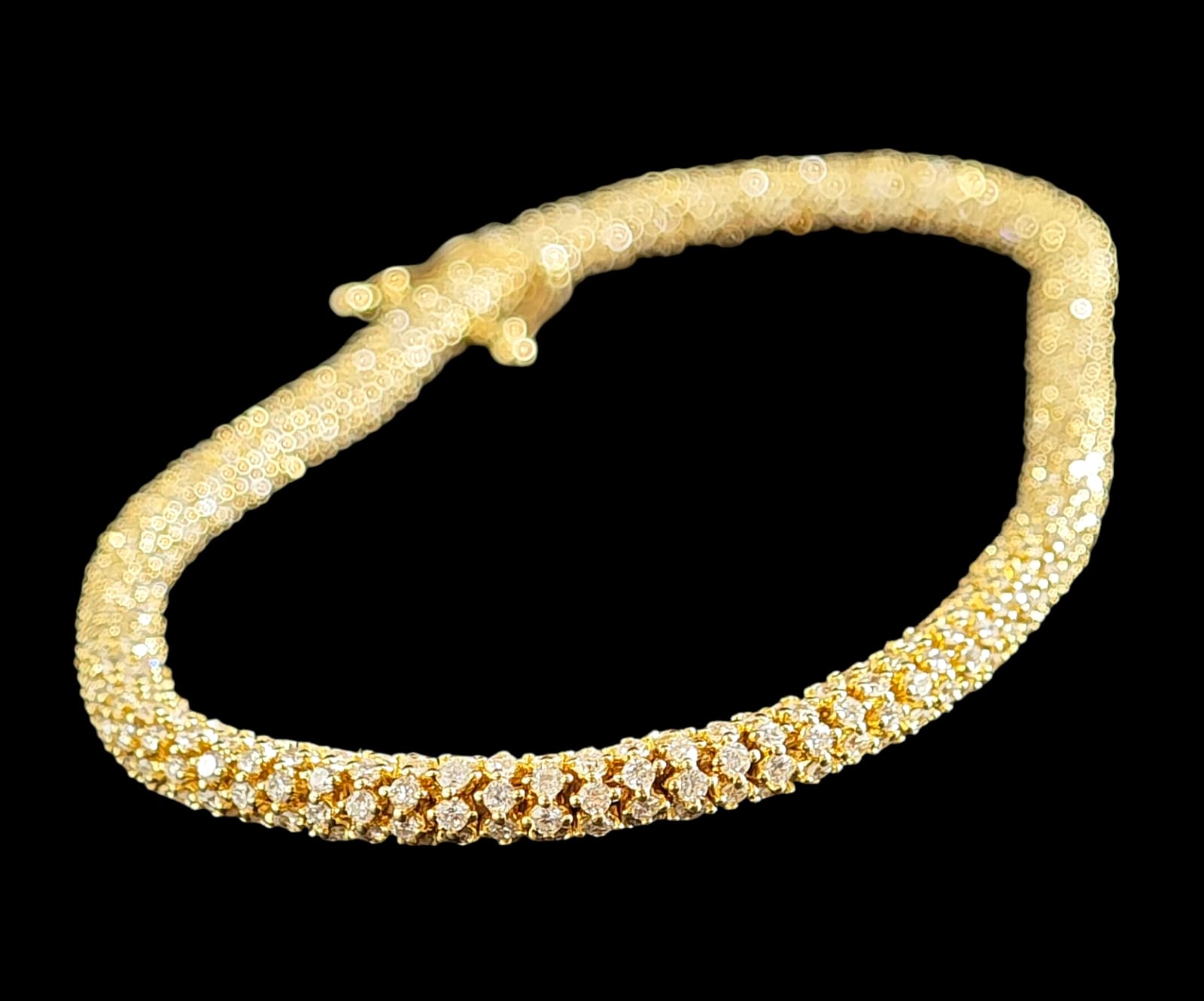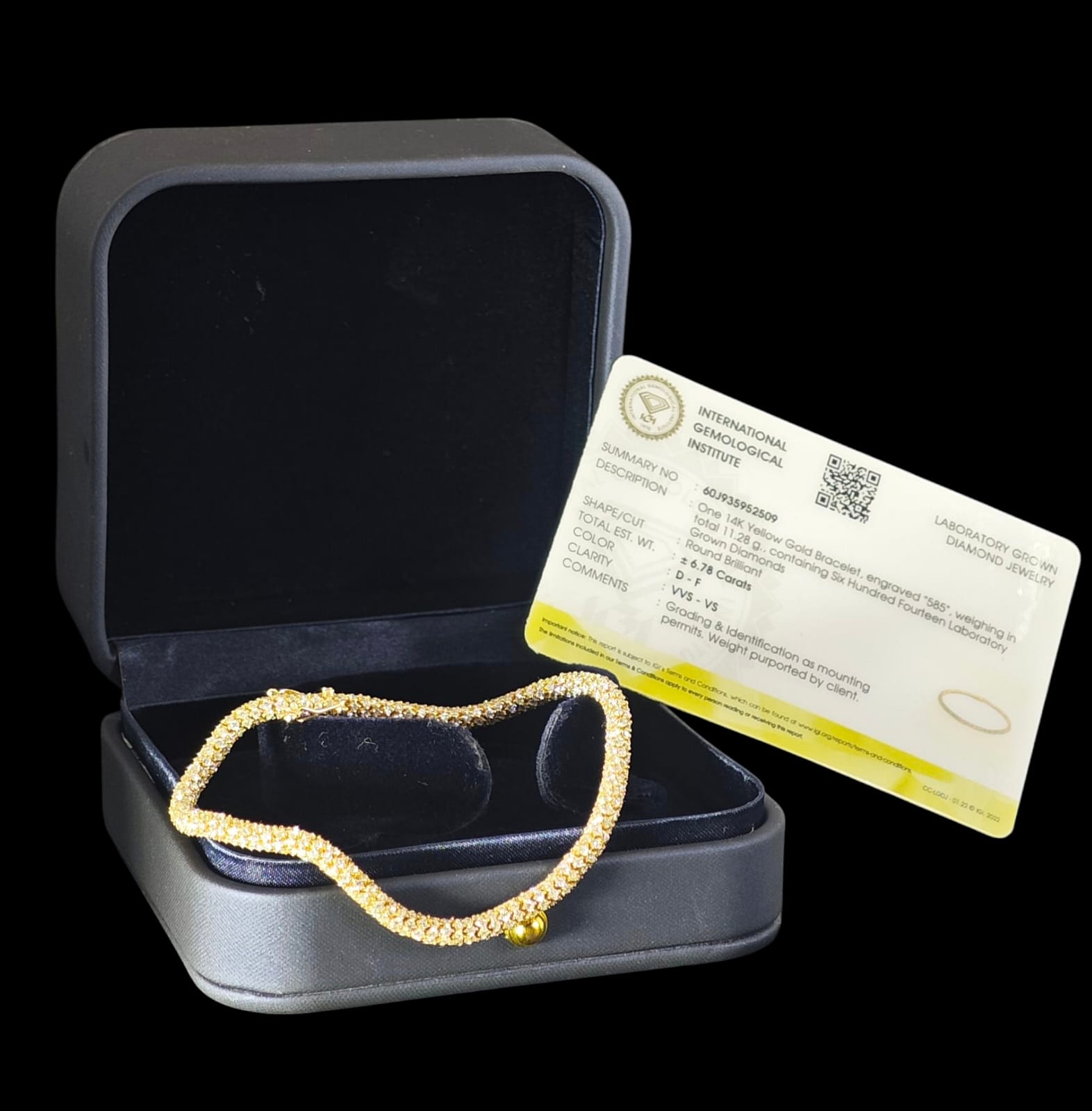Un bracciale in oro giallo 14K, certificato IGI, con un design flessibile interamente incastonato con 614 diamanti lab-grown taglio brillante rotondo, con un peso totale stimato di 6.78 carati. I diamanti presentano un colore D-F e una purezza VVS-VS. Il bracciale si chiude con una chiusura a scatola, chiaramente marcata "585", e include due fermagli di sicurezza. Lunghezza: circa 18.5 cm - COMMISSIONE D’ASTA 25%