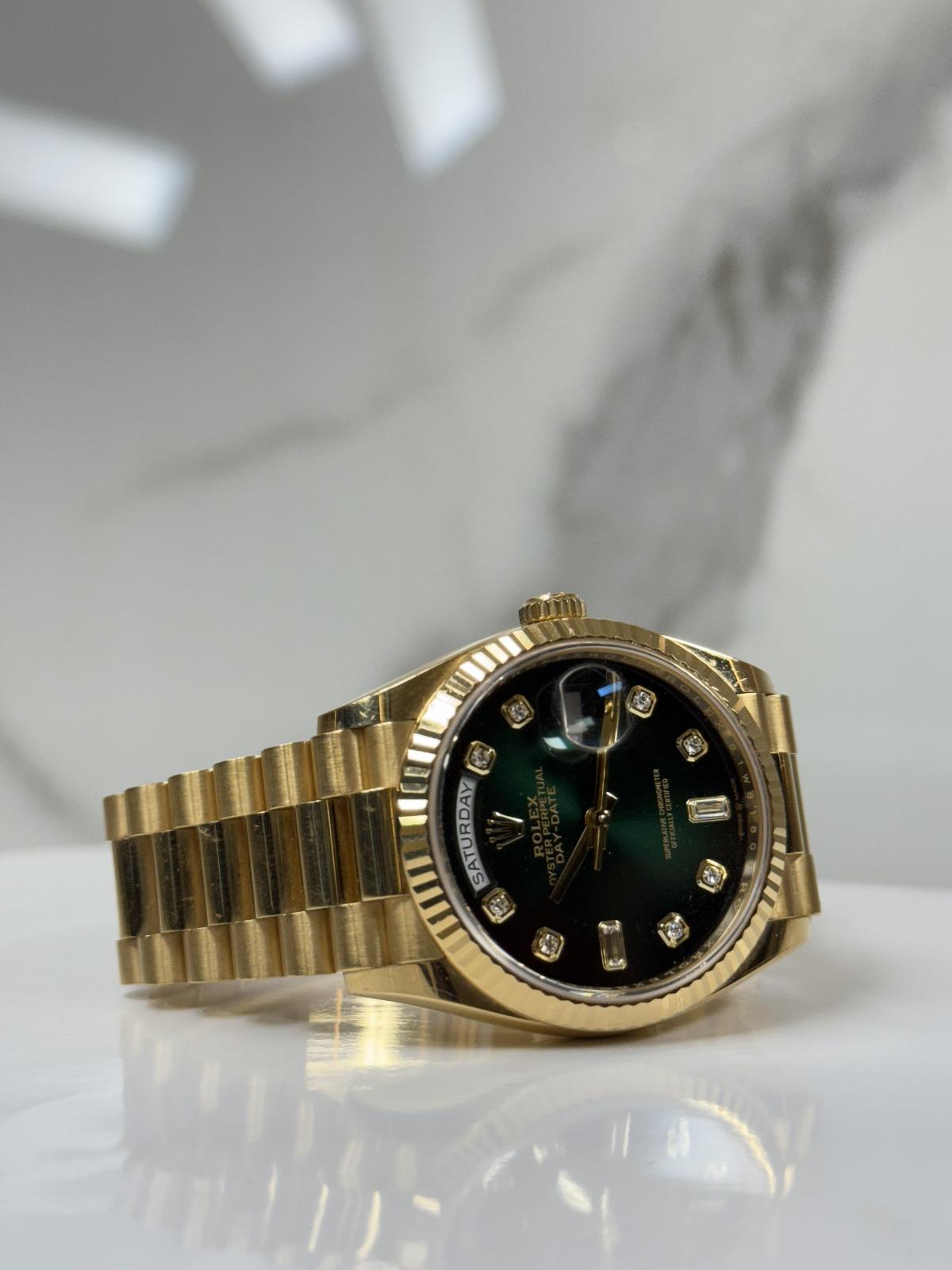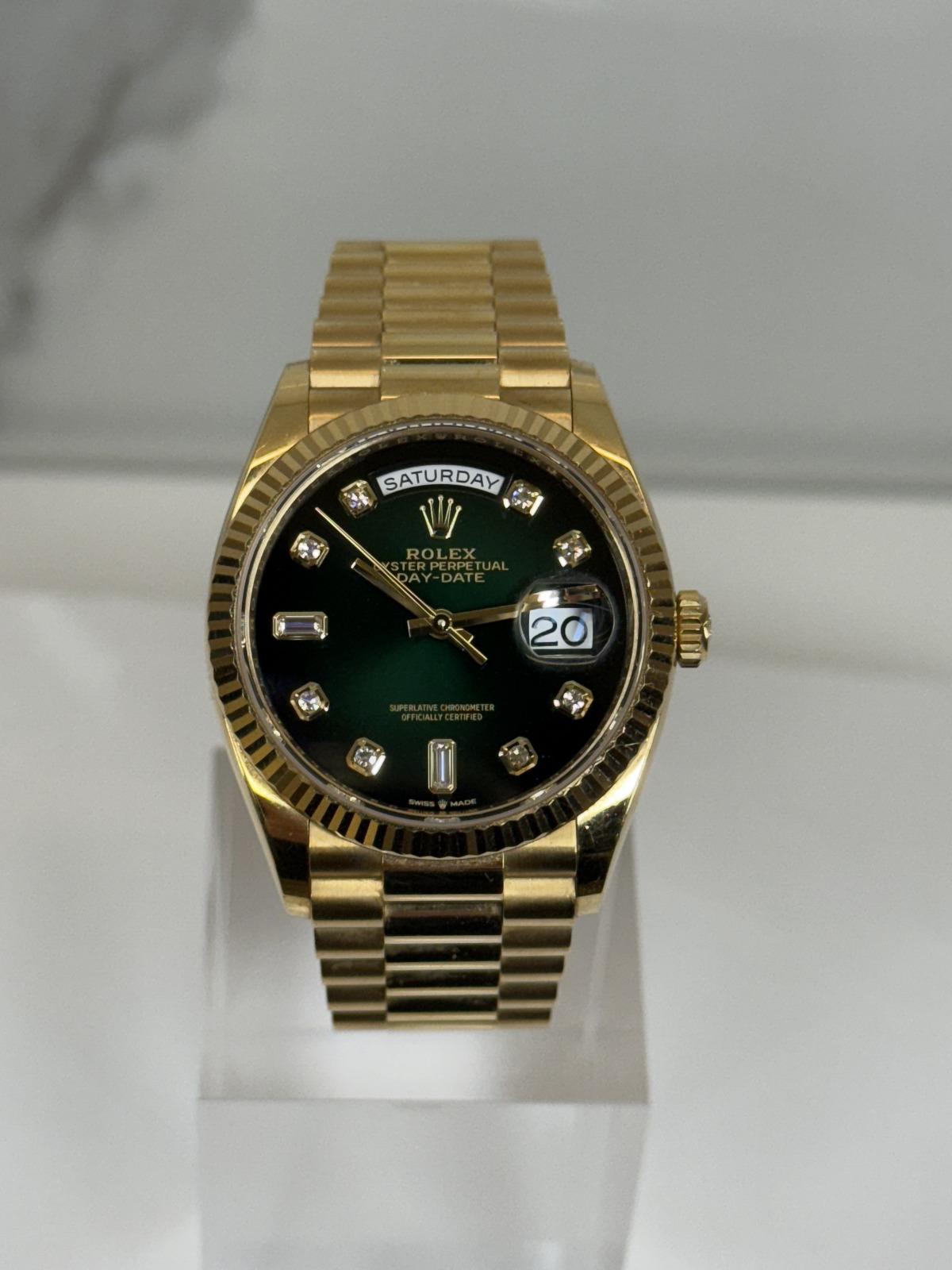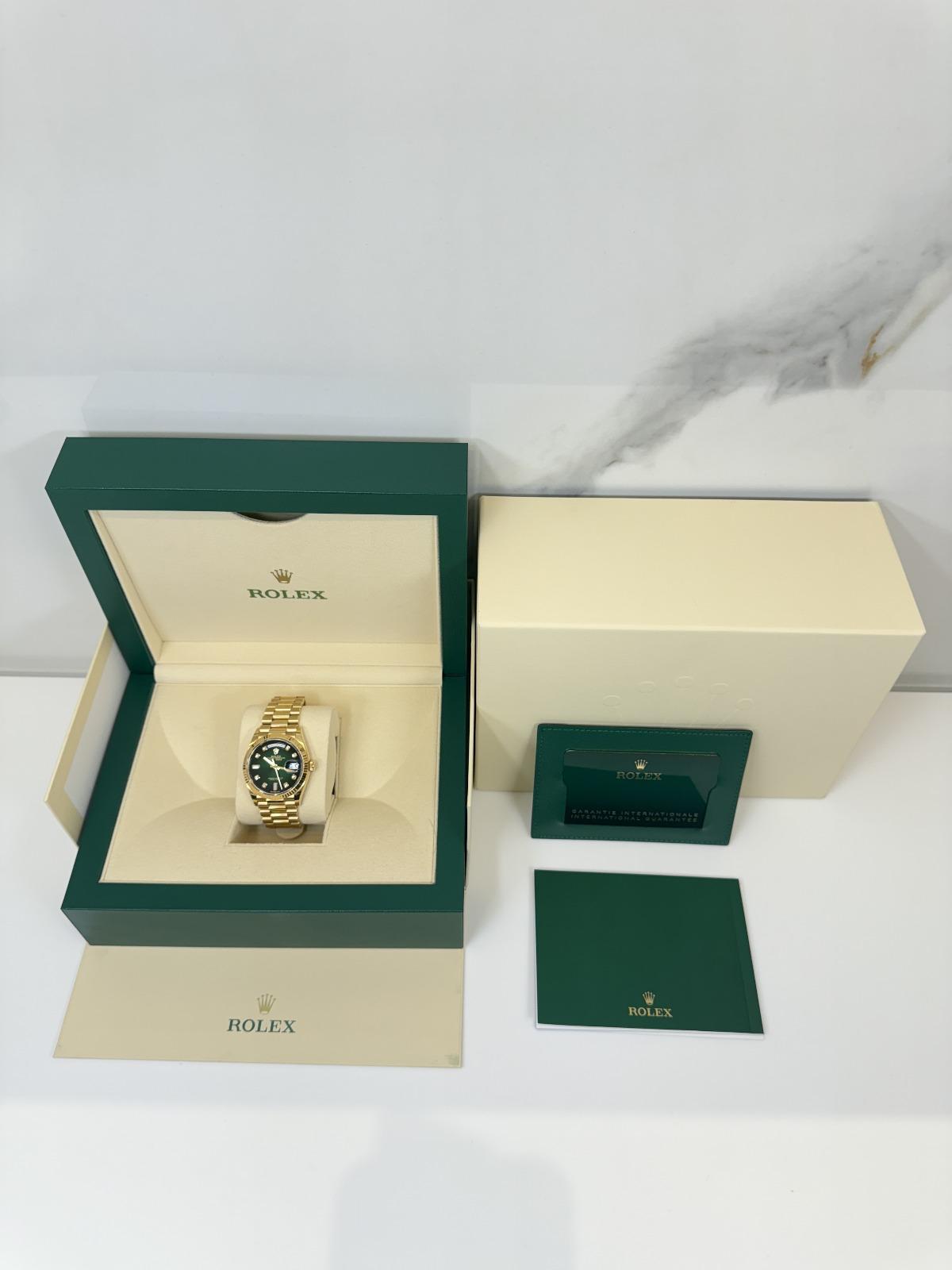 Marca Rolex Modello (Orologio) Day-Date 36 Numero di referenza 128238 Carica Automatico Materiale della cassa Oro giallo Materiale cinturino Oro giallo Anno di produzione 2022 Condizione Come nuovo documenti originali, no box Carica Automatico Materiale della cassa Oro giallo Diametro 36 x 43 mm Impermeabile 10 ATM Materiale lunetta Oro giallo Vetro Vetro zaffiro Quadrante Verde Materiale cinturino Oro giallo Colore cinturino Oro Chiusura Déployante Materiale chiusura Oro giallo - COMMISSIONE D’ASTA 25%