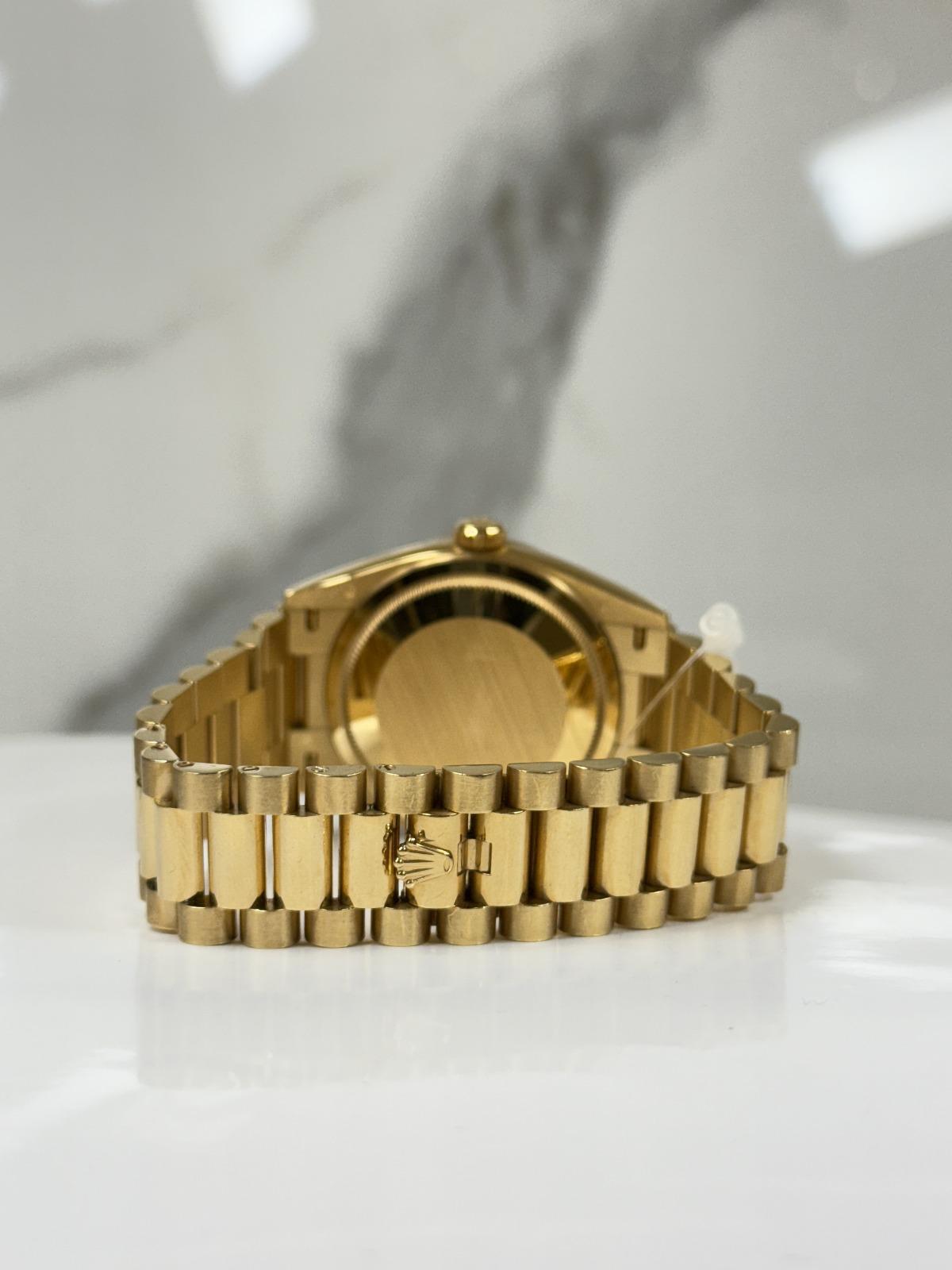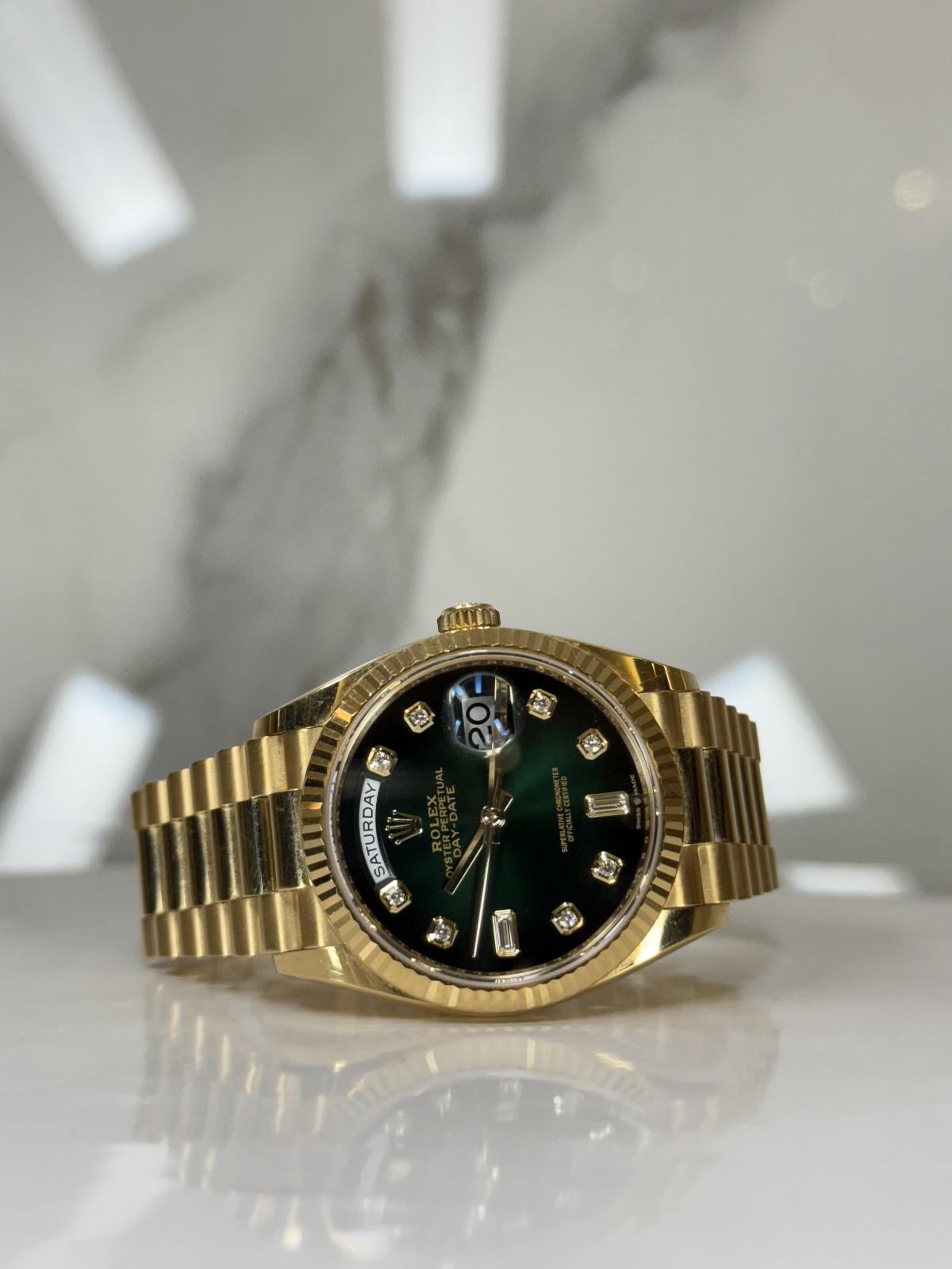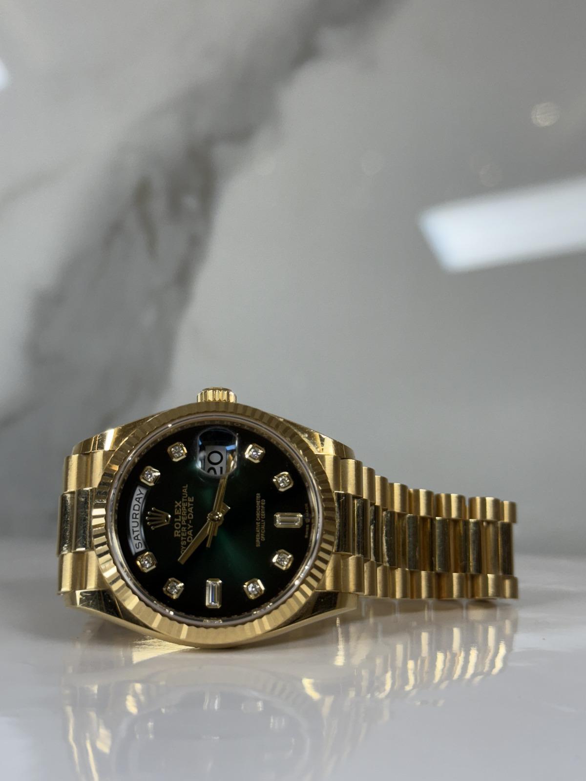 Marca Rolex Modello (Orologio) Day-Date 36 Numero di referenza 128238 Carica Automatico Materiale della cassa Oro giallo Materiale cinturino Oro giallo Anno di produzione 2022 Condizione Come nuovo documenti originali, no box Carica Automatico Materiale della cassa Oro giallo Diametro 36 x 43 mm Impermeabile 10 ATM Materiale lunetta Oro giallo Vetro Vetro zaffiro Quadrante Verde Materiale cinturino Oro giallo Colore cinturino Oro Chiusura Déployante Materiale chiusura Oro giallo - COMMISSIONE D’ASTA 25%