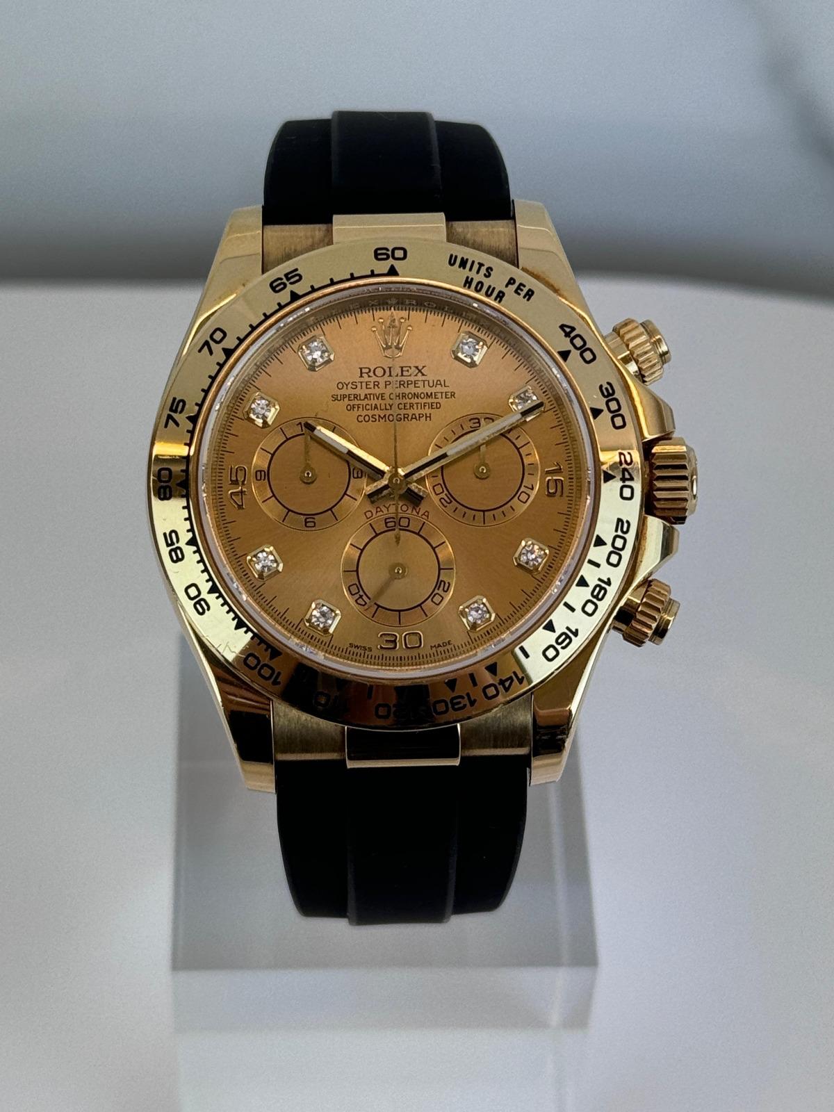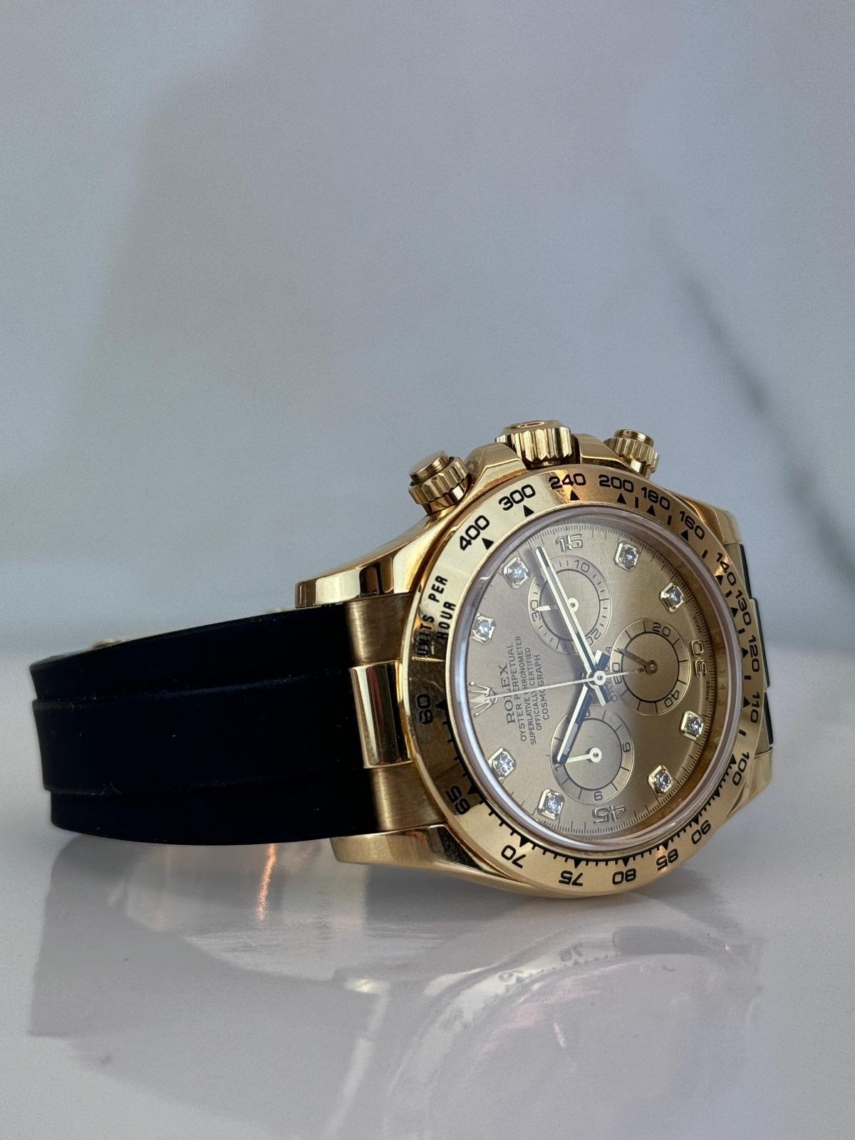 Marca Rolex Modello (Orologio) Daytona Numero di referenza 116518 Carica Automatico Materiale della cassa Oro giallo Materiale cinturino Pelle aftermarket Anno di produzione 2008 Condizione Ottimo (di seconda mano, segni di usura assenti o appena visibili) Corredo documenti originali Rolex, no box Cassa Materiale della cassa Oro giallo Diametro 40 mm Impermeabile 10 ATM Materiale lunetta Oro giallo Vetro Vetro zaffiro Materiale cinturino Pelle originale marrone ed oysterflex di fornitura Chiusura Déployante Materiale chiusura Oro giallo Funzioni Cronografo Quadrante blu racing - COMMISSIONE D’ASTA 25%