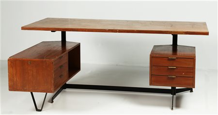 BORSANI OSVALDO (1911 - 1985) Tavolo T95. Ferro e legno. Cm 180,00 x 85,00 x 77,00. Produzione per Tecno. Tavolo da lavoro in legno di mogano lucidato al naturale. Supporti e piedestalli in ferro trafilato e vetrificato nero, completamente smontabile. Le cassettiere girevoli sull'asse del supporto possono essere invertite di posizionea destra e a sinistra. Scheda illustrativa originale con foto della casa di produzione.