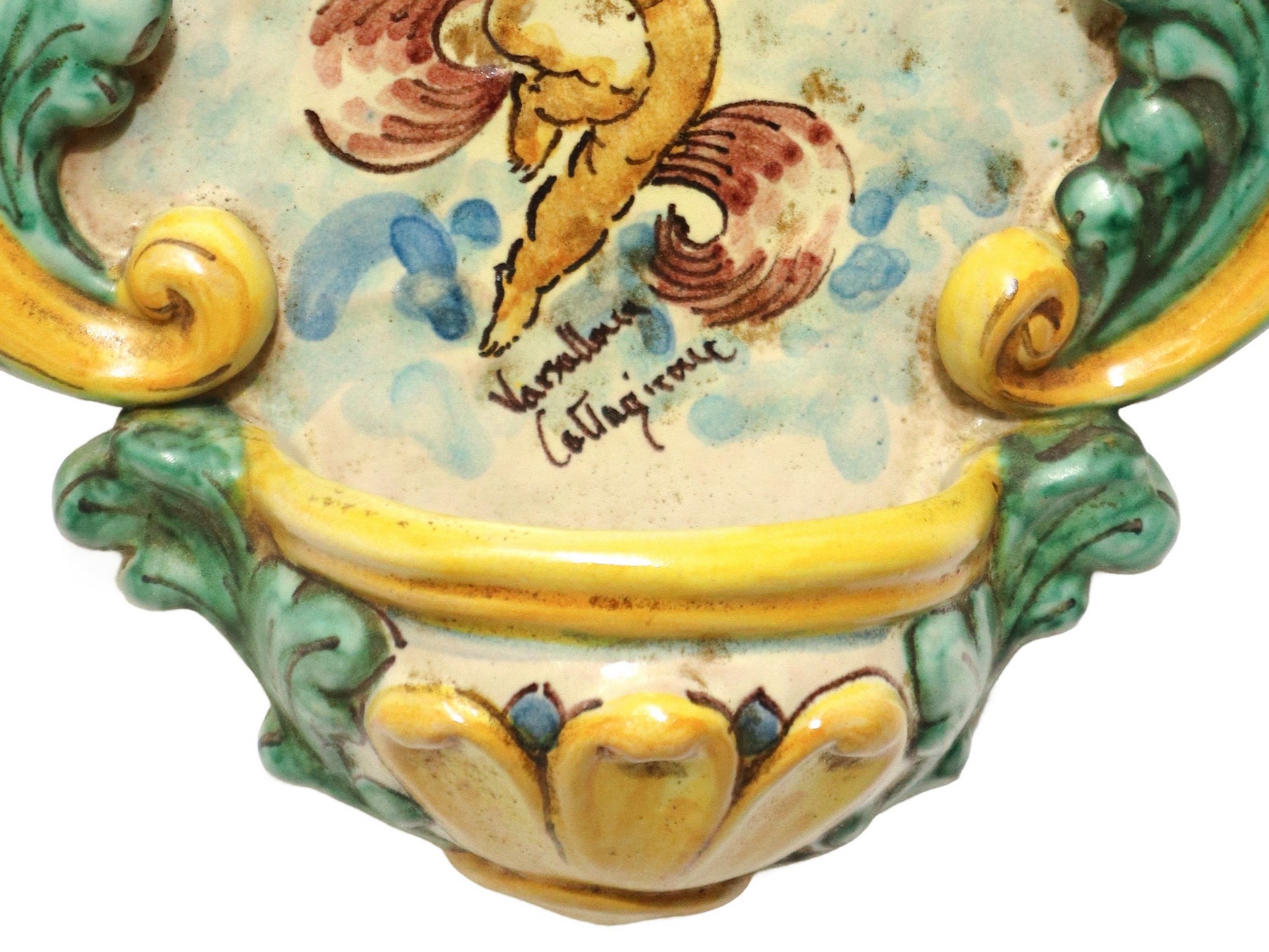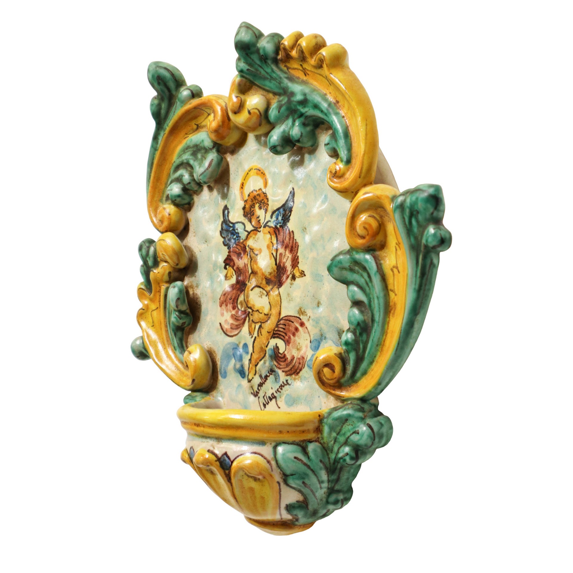 Riccardo Varsallona ceramiche (Caltagirone) - Acquasantiera in maiolica di Caltagirone dipinta policroma con raffigurazione di un putto