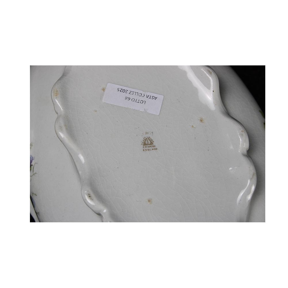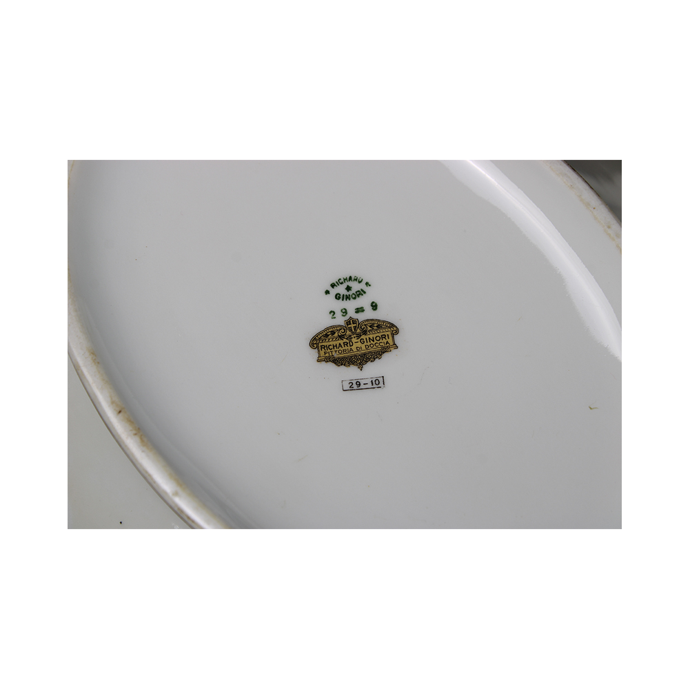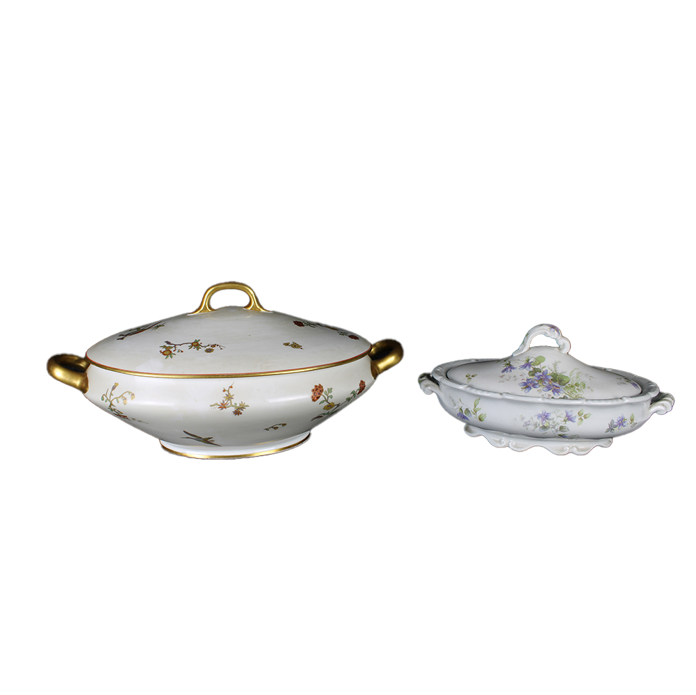 2 ZUPPIERE in porcellana dipinta a motivi floreali e lumeggiature in oro, una Richard Ginori ed una inglese XX secolo h cm 19 x 41 x 25 - h cm 13 x 29,5 x 18