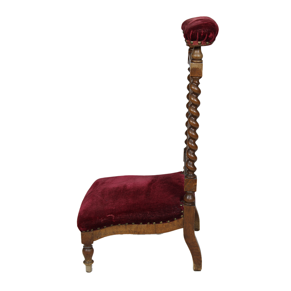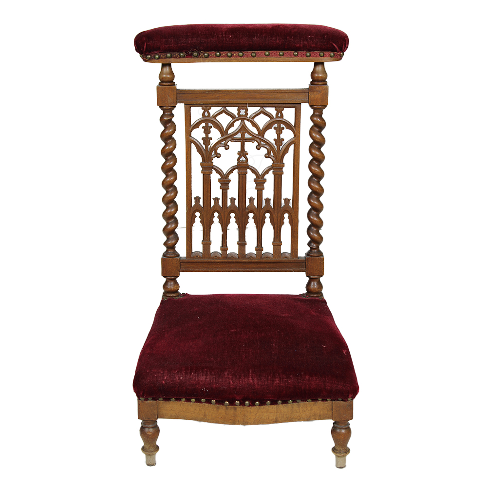 INGINOCCHIATOIO in legno di rovere, tornito, traforato e scolpito rivestito in velluto Sicilia XIX secolo h cm 90 x 50 x 45