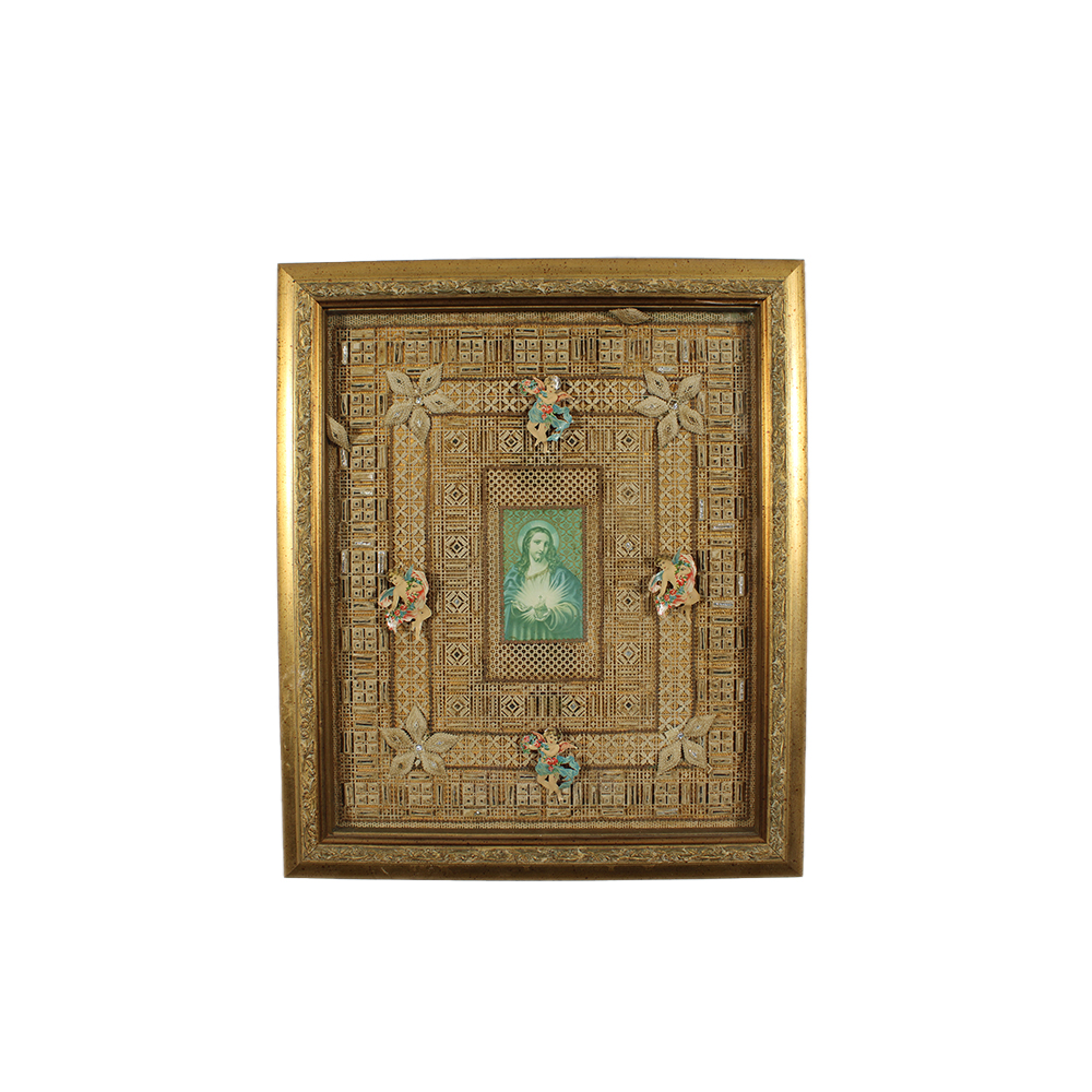 STAMPA COLORATA con passepartout a diorama in carta traforata dentro cornice in legno dorato Sicilia XX secolo h cm 64 x 54,5