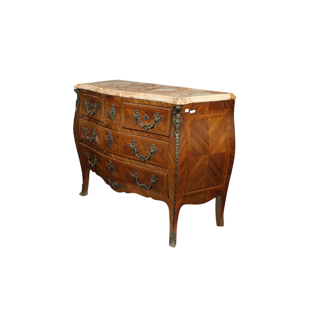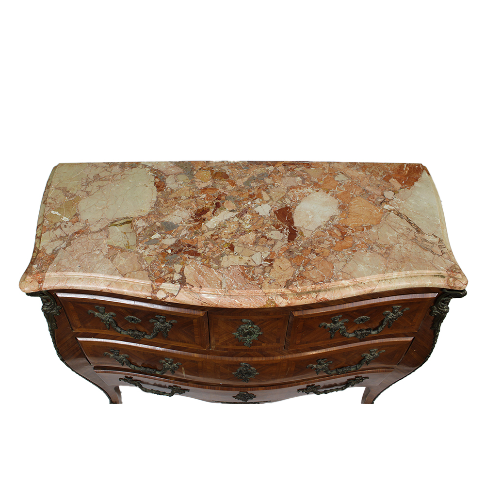 CASSETTONE DI GUSTO LUIGI XV in palissandro a 2 cassetti nella parte inferiore e 2 cassetti più piccoli nella parte superiore, arricchito da fregi in bronzo finemente cesellato, piano in marmo breccia francese Francia primi 900 h cm 90 x 114 x 50