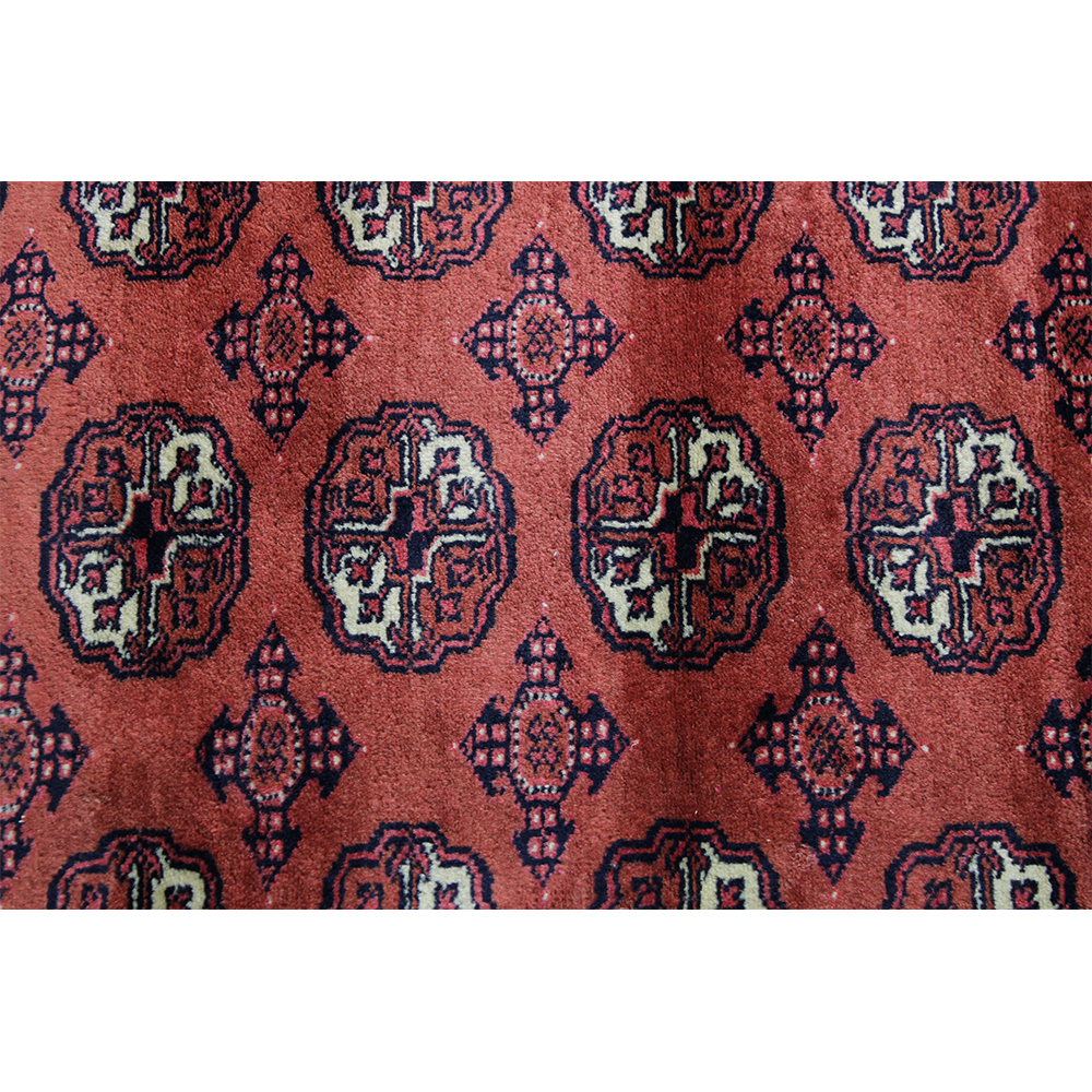 TAPPETO TURKMAN lana su cotone annodato a mano, campo rosso con fili di gul ripetuti, bordure geometriche nei toni di rosso e nero II metà del XX secolo cm 207 x 126