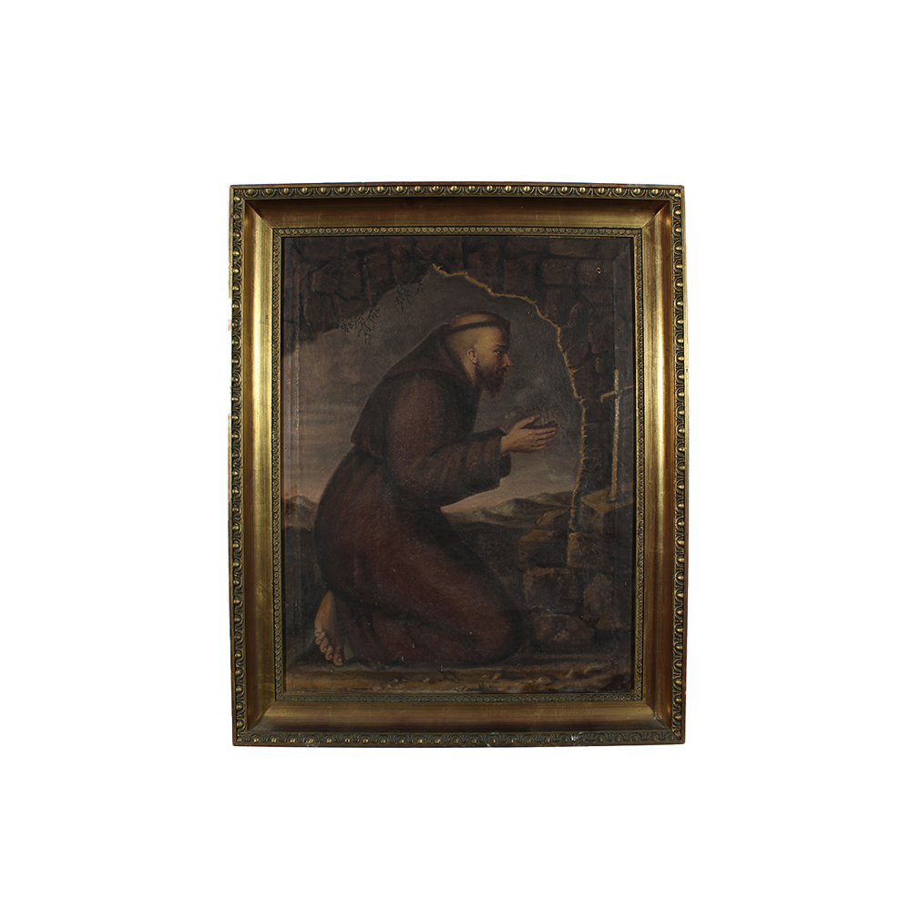 OLIO SU TELA raffigurante San Francesco in preghiera dentro cornice in legno dorato maestranze italiane fine XIX secolo h cm 73 x 57 - cornice h cm 85,5 x 69
