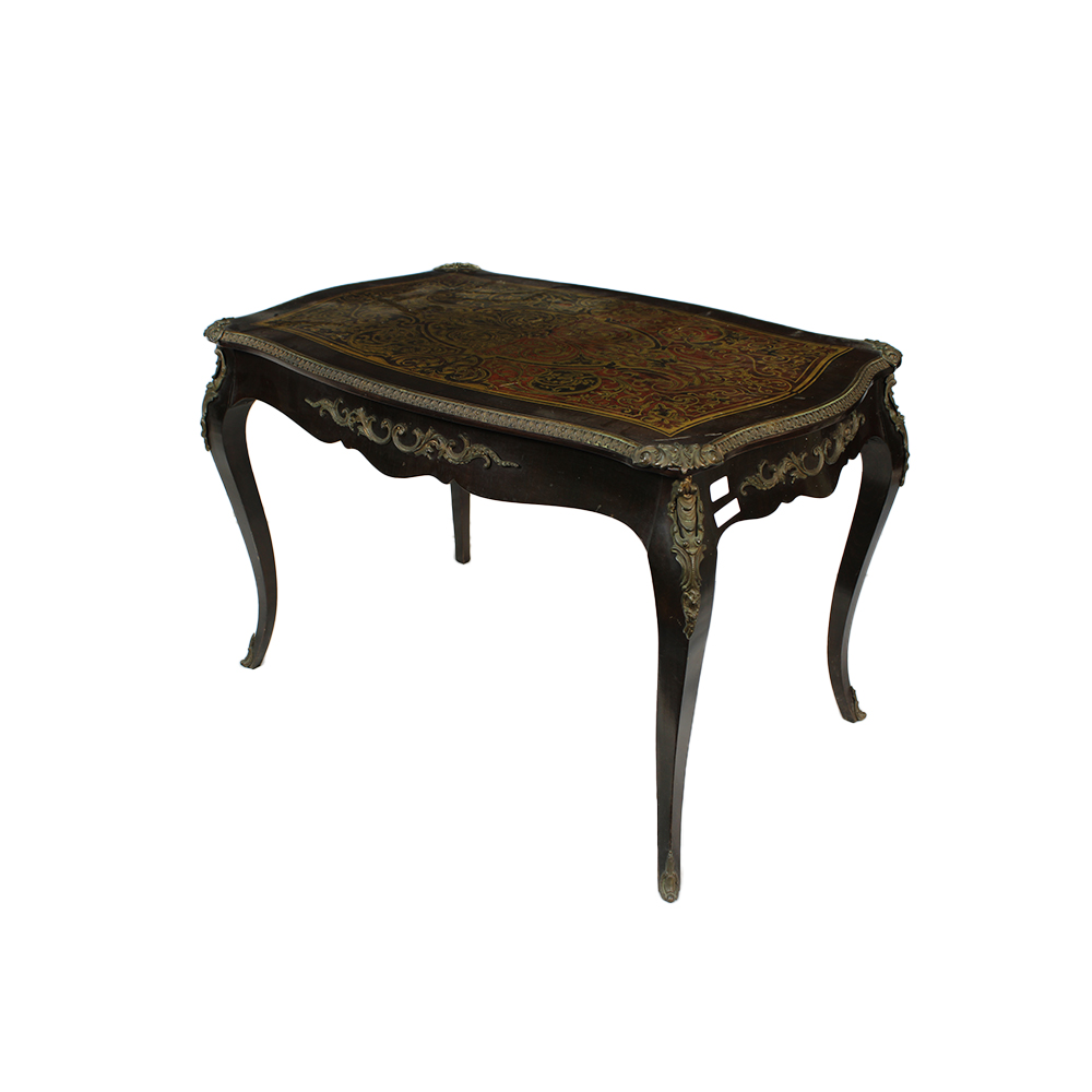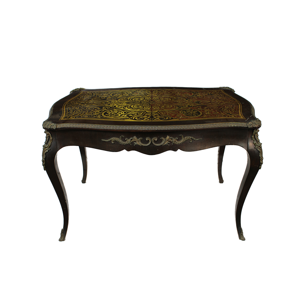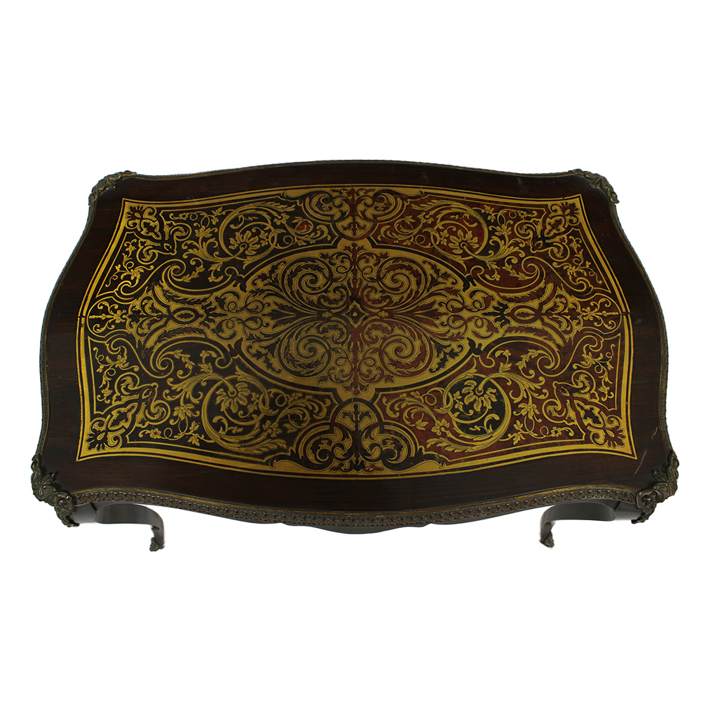 TAVOLINO DI GUSTO BOULLE in legno di palissandro con tarsie in ottone, arricchito da applicazioni in bronzo manifattura italiana primi 900 h cm 54 x 81 x 52