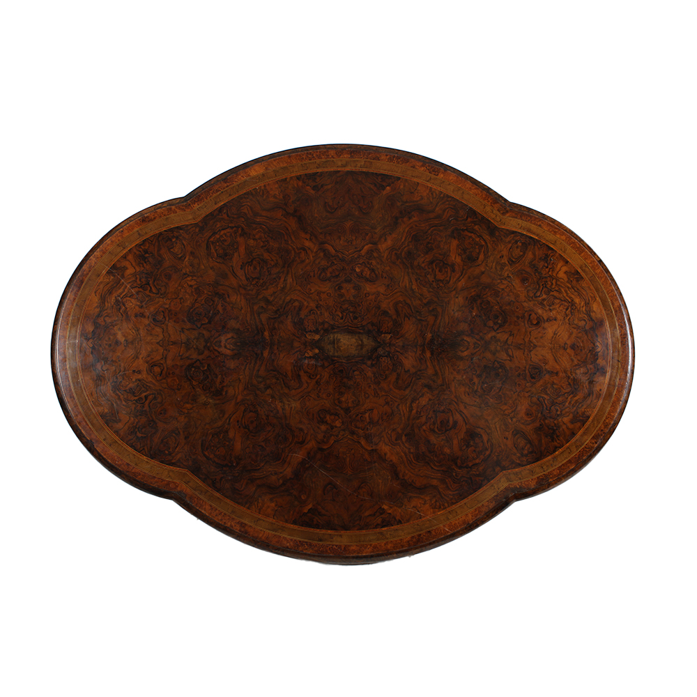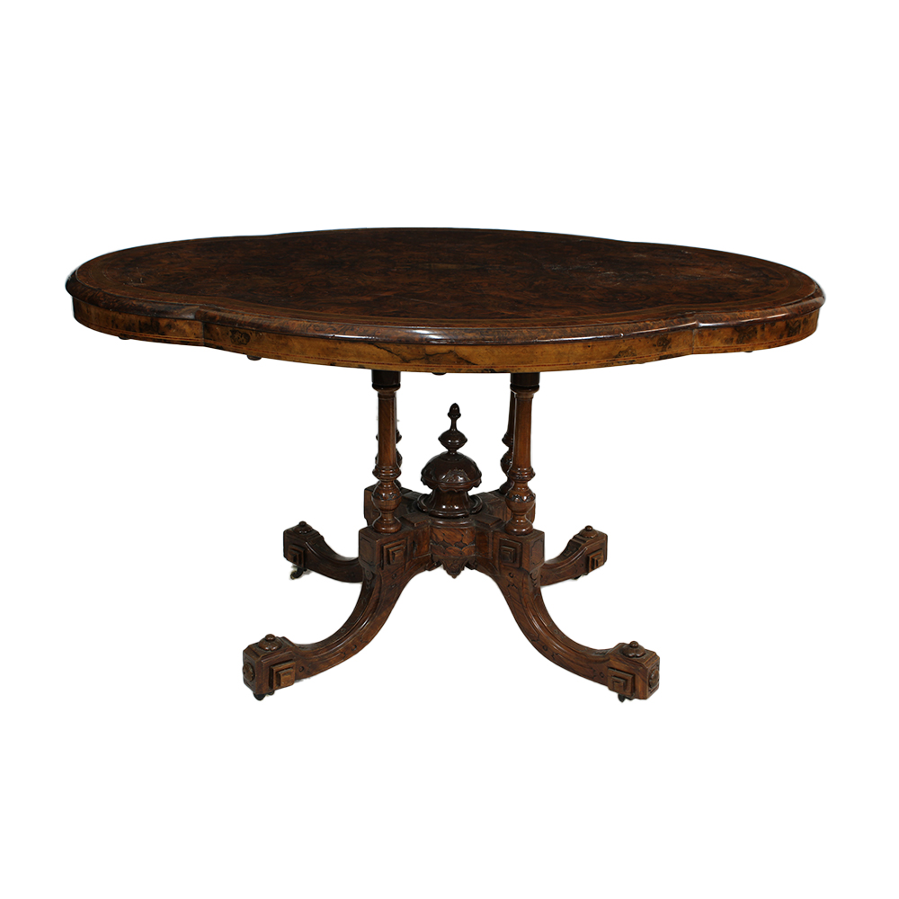 TAVOLO DA CENTRO VITTORIANO A VELA con piano lastronato in radica di noce e intarsiato in radica di olmo e perfili in legno rosa, bosso e legni ebanizzati, piede centrale con colonna in legno di noce Inghilterra XX secolo h cm 77 x 138 x 100