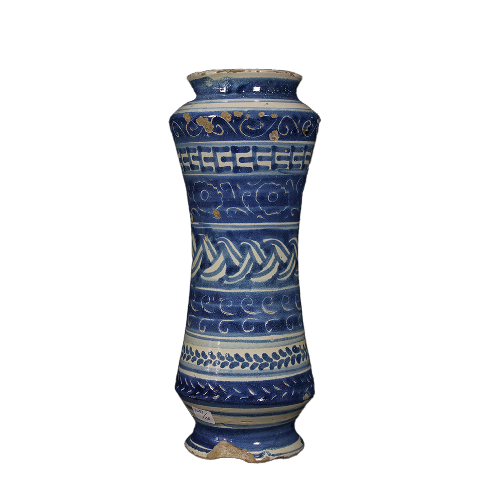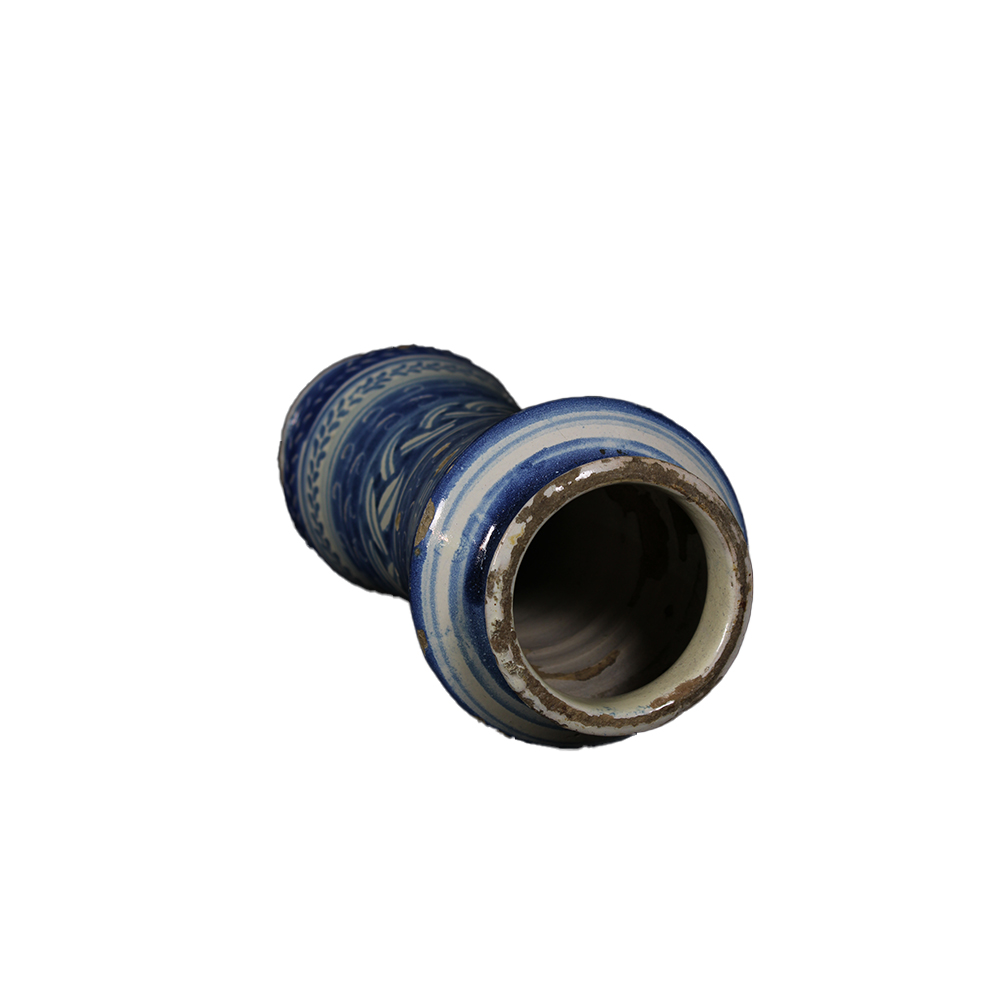 ALBARELLO in maiolica dipinta a fondo bianco e blu a motivi greche, sbeccature alla base e usure del tempo manifattura Caltagirone XVI/XVII secolo h cm 31 x 13