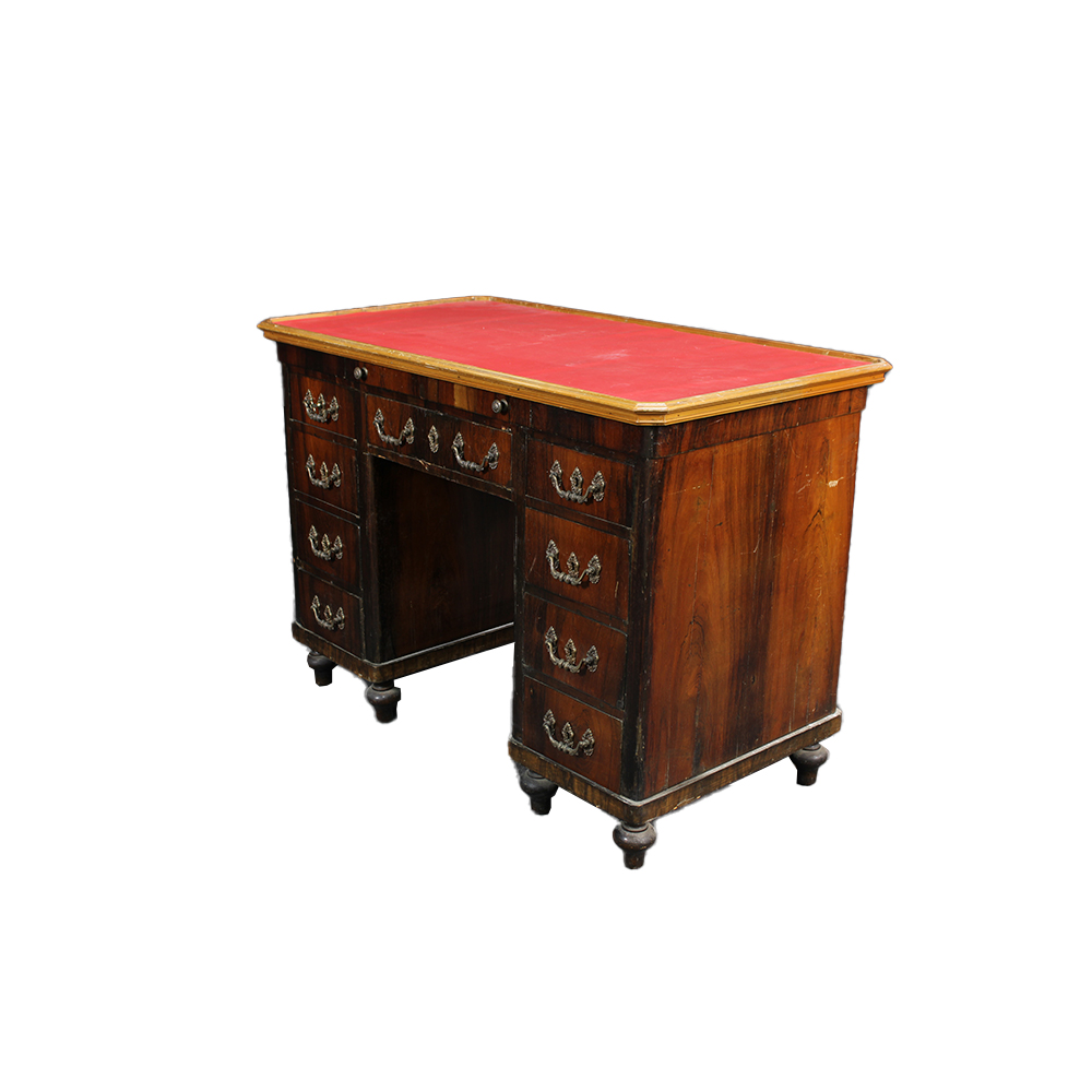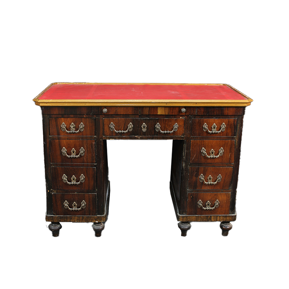 SCRIVANIA A SCAGNO in legno di palissandro a 4 cassetti per lato ed 1 centrale a tiretto scrittoio piano in pelle arricchito da maniglie e borchie in bronzo Sicilia primi 900 h cm 88 x 123 x 67