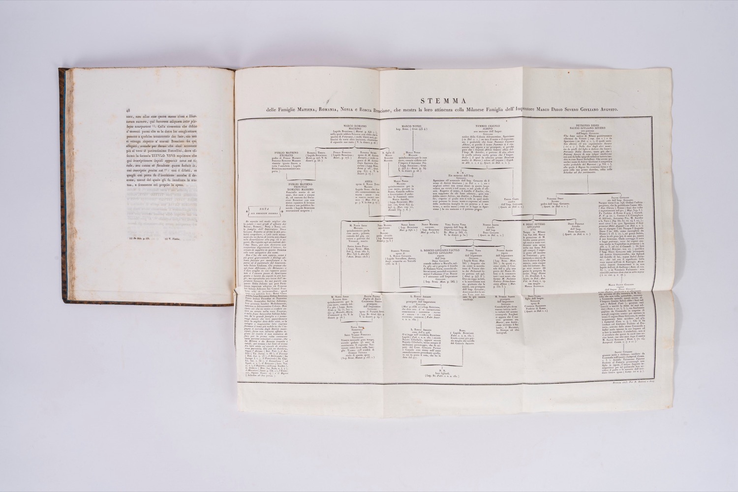 Brescia, Nicolò Bettoni, 1823. In 4°. Vignetta calcografica al frontespizio che raffigura un’antica moneta romana, tavola con albero genealogico ripiegato di alcune famiglie bresciane e 4 tavole in rame in fine al volume, legatura coeva in vitello, piatti inquadrati da cornice in oro, titolo in oro entro tassello rosso al dorso liscio con fregi. Firma di appartenenza alla carta di guardia datata Brescia, 1931.Brescia, Nicolò Bettoni, 1823. In 4°. Vignetta calcografica al frontespizio che raffigura un’antica moneta romana, tavola con albero genealogico ripiegato di alcune famiglie bresciane e 4 tavole in rame in fine al volume, legatura coeva in vitello, piatti inquadrati da cornice in oro, titolo in oro entro tassello rosso al dorso liscio con fregi. Firma di appartenenza alla carta di guardia datata Brescia, 1931.