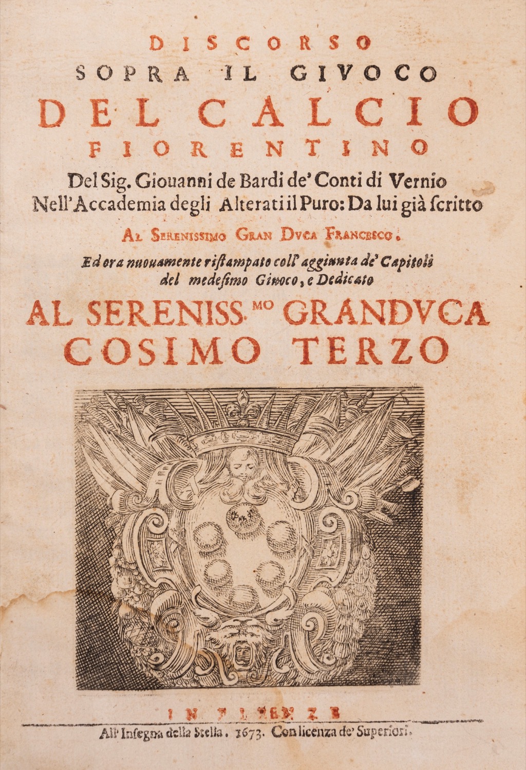 In Firenze, All'Insegna della Stella, 1673. In 4°. Frontespizio impresso a due colori con stemma calcografico di Cosimo III, 2 carte calcografiche a doppia pagina legate in fine, marginali aloni di umidità altrimenti ottimo esemplare, legatura in mezza pergamena e cartone del sec.XIX. Timbro del Seminario Vescovile di Verona, con relativo annullo all'ultima carta.In Firenze, All'Insegna della Stella, 1673. In 4°. Frontespizio impresso a due colori con stemma calcografico di Cosimo III, 2 carte calcografiche a doppia pagina legate in fine, marginali aloni di umidità altrimenti ottimo esemplare, legatura in mezza pergamena e cartone del sec.XIX. Timbro del Seminario Vescovile di Verona, con relativo annullo all'ultima carta.