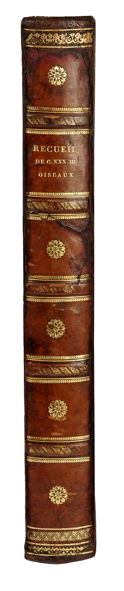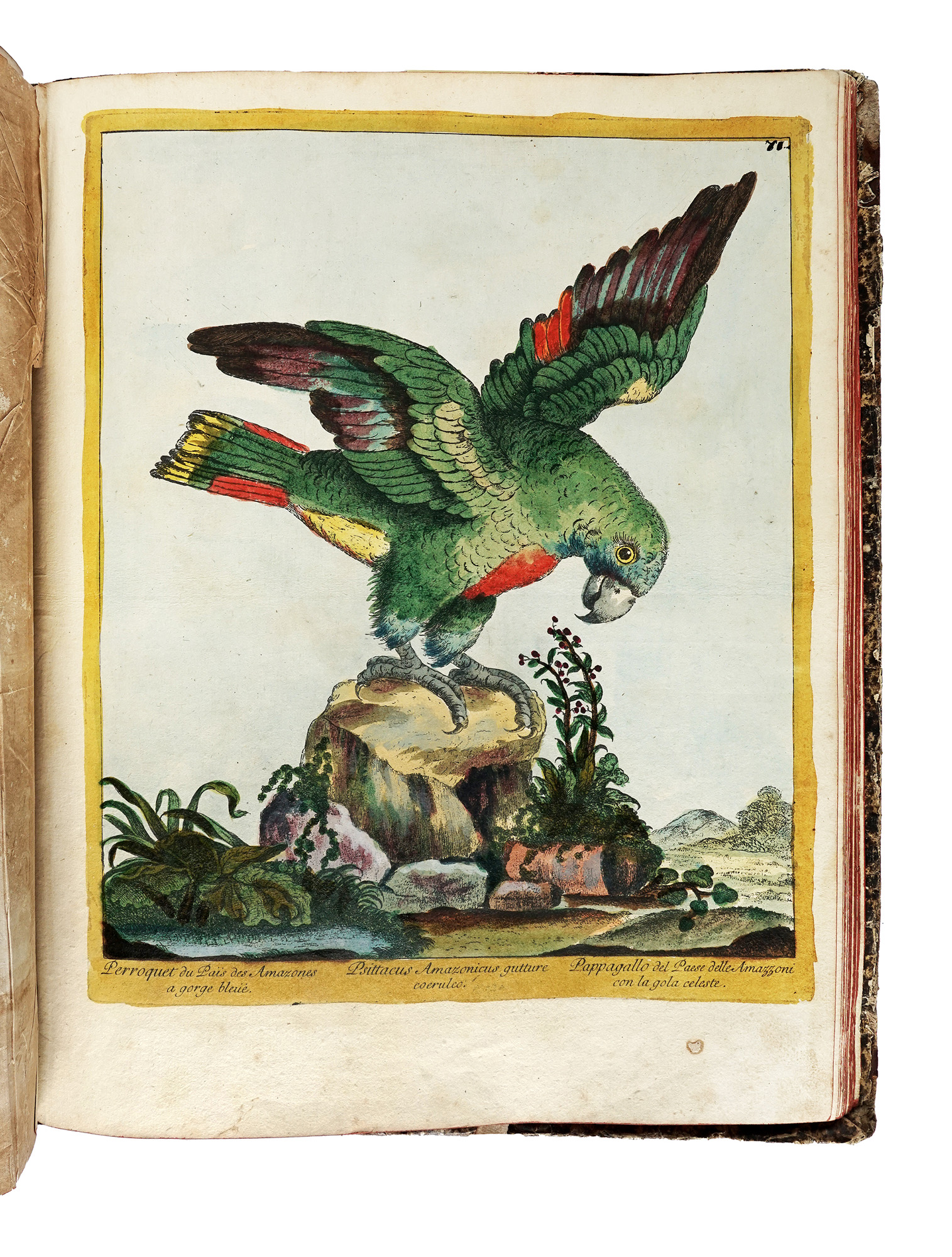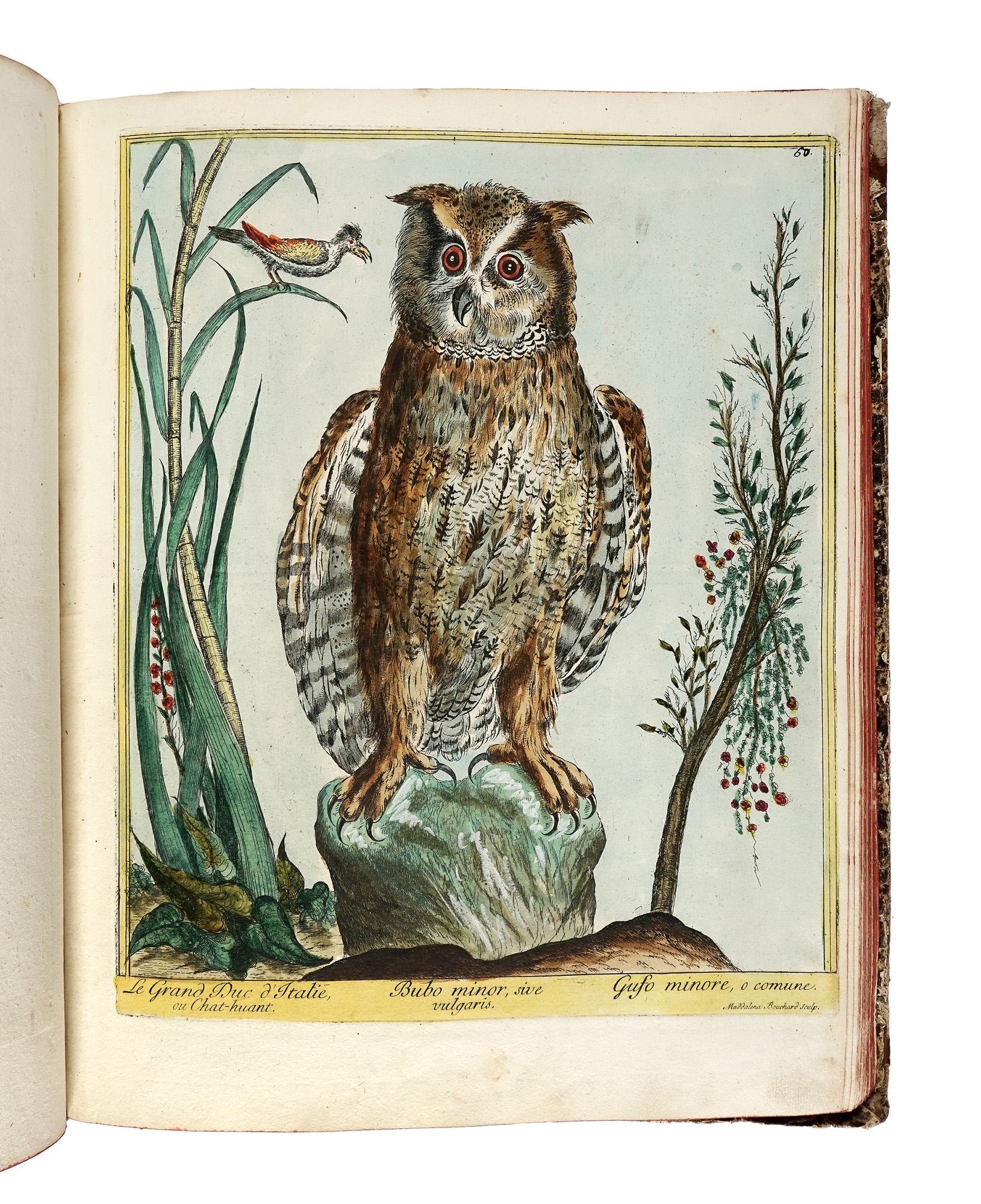 Grande In-folio (mm 450x360). Nissen, 124. Anker, 53. Frontespizio calcografico in rosso e nero, e 83 tavole (di 87), incise a bulino e in bella coloritura coeva, con veline protettive. Esemplare mancante delle tavv. 21,23,26, 75. Rarissima copia quasi completa di questa celebre opera, una delle più ricercate per le sue splendide tavole ornitologiche. Pubblicata senza testo, questa raccolta comprende 87 tavole raffiguranti 133 uccelli principalmente rapaci, avvoltoi, gufi e pappagalli. Le copie complete sono molto rare, essendo le tavole spesso vendute separatamente. Le incisioni sono firmate da Maddalena Bouchard, figlia dell'editore Giovanni Bouchard, e sono finemente acquerellate a mano, incorniciate da una bordura di filetti dipinti in giallo e recano i nomi francese, latino e italiano di ciascun uccello nella didascalia. Legatura coeva in mezza pelle e cartonato, sguardie in carta marmorizzata, cinque nervature al dorso con fregi, rosette e titolo impressi in oro. Bibliografia: Claus Nissen, Die illustrierten Vogelbücher. Geschichte und Bibliographie, Stuttgart 1953. Jean Anker, Bird Books and Bird Art, Levin & Munksgaard, Copenhagen 1938. (1) Legatura con difetti ai piatti e alle carte di sguardia, strappo in basso a sinistra alla tavola 17, veline protettive e alcune tavole con traccia di brunitura. Alcuni aloni di umidità in basso in corrispondenza della legatura.