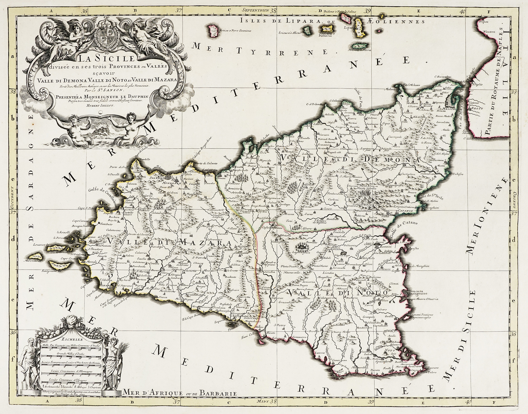 Alexis-Hubert Jaillot Nicolas Sanson, La Sicile divisée en ses trois Provinces ou Valées sçavoir Valle di Demona, Valle di Noto et Valle di Mazara... / par Hubert Jaillot. A Paris soignant les Grands Augustins aux deux Globes, 1692.