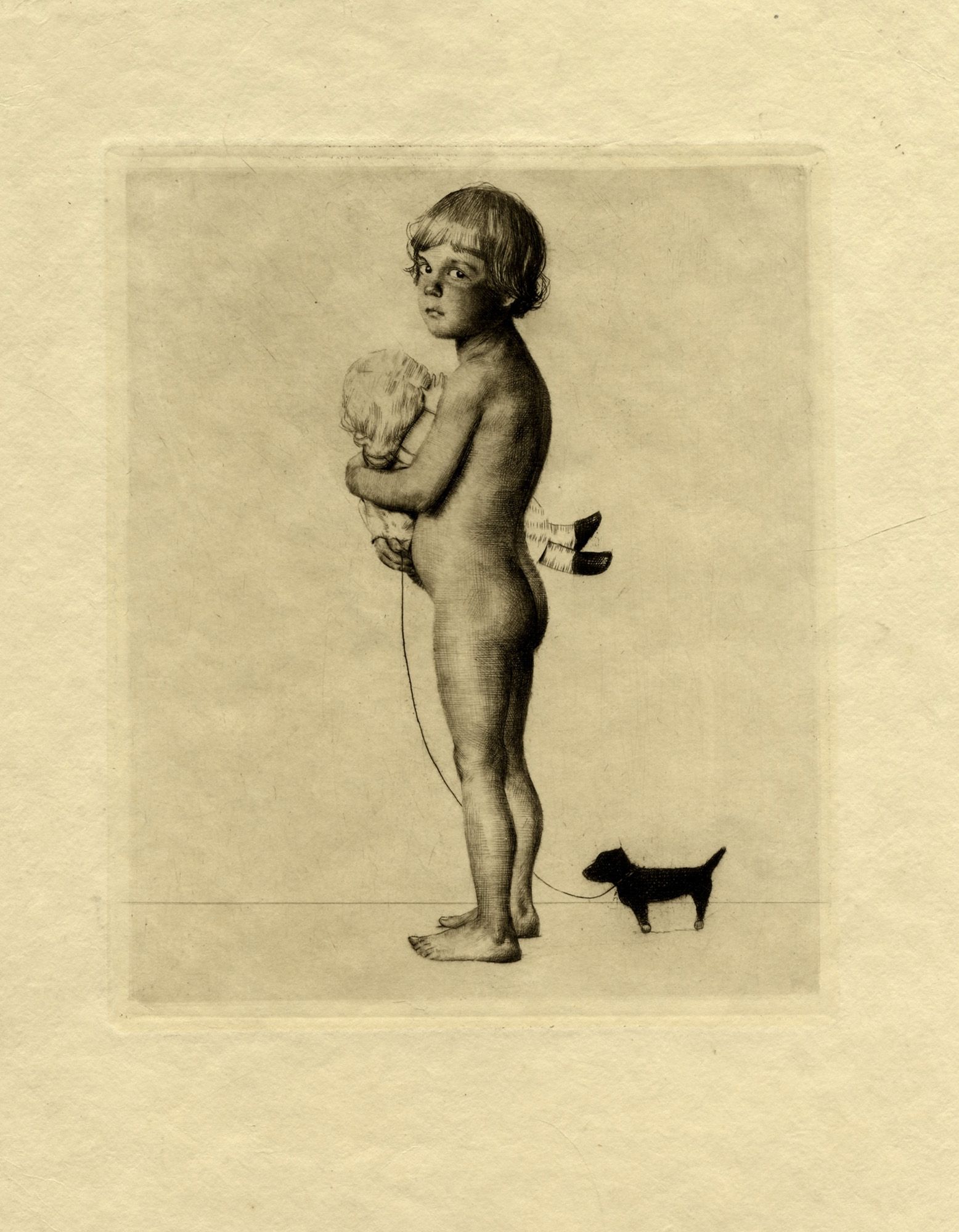 1) Bambino con cane. Acquaforte e puntasecca su carta Giappone. mm 150x125. Foglio: mm 250x195. 2) Volto di bambino di profilo. Acquaforte e puntasecca. mm 290x180. Foglio: mm 390x280. (2) Minime pieghe angolari. Ottima conservazione.