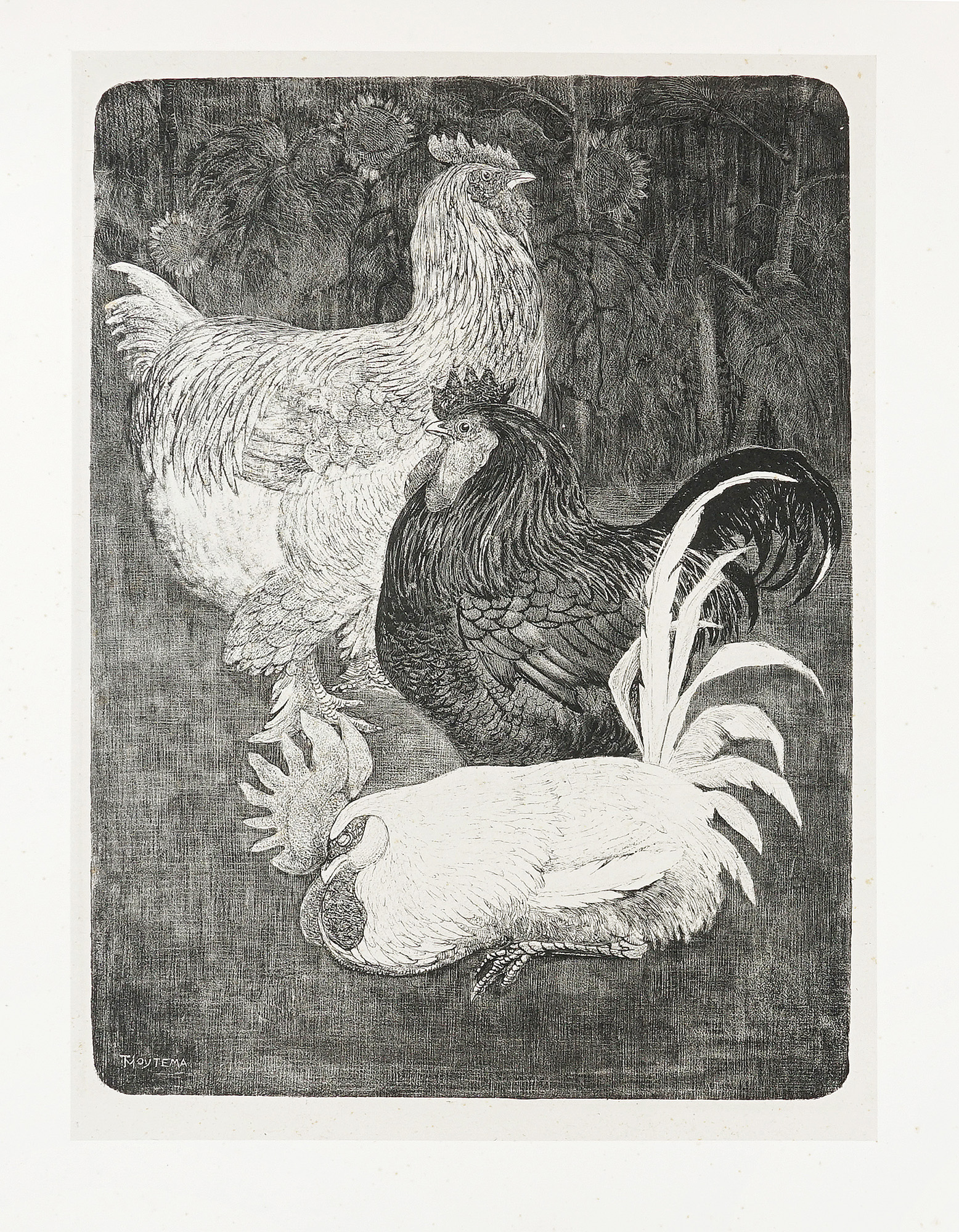 Theodoor Van Hoytema, Lotto composto di 2 incisioni. 1897. 1) Drie hanen (Tre...