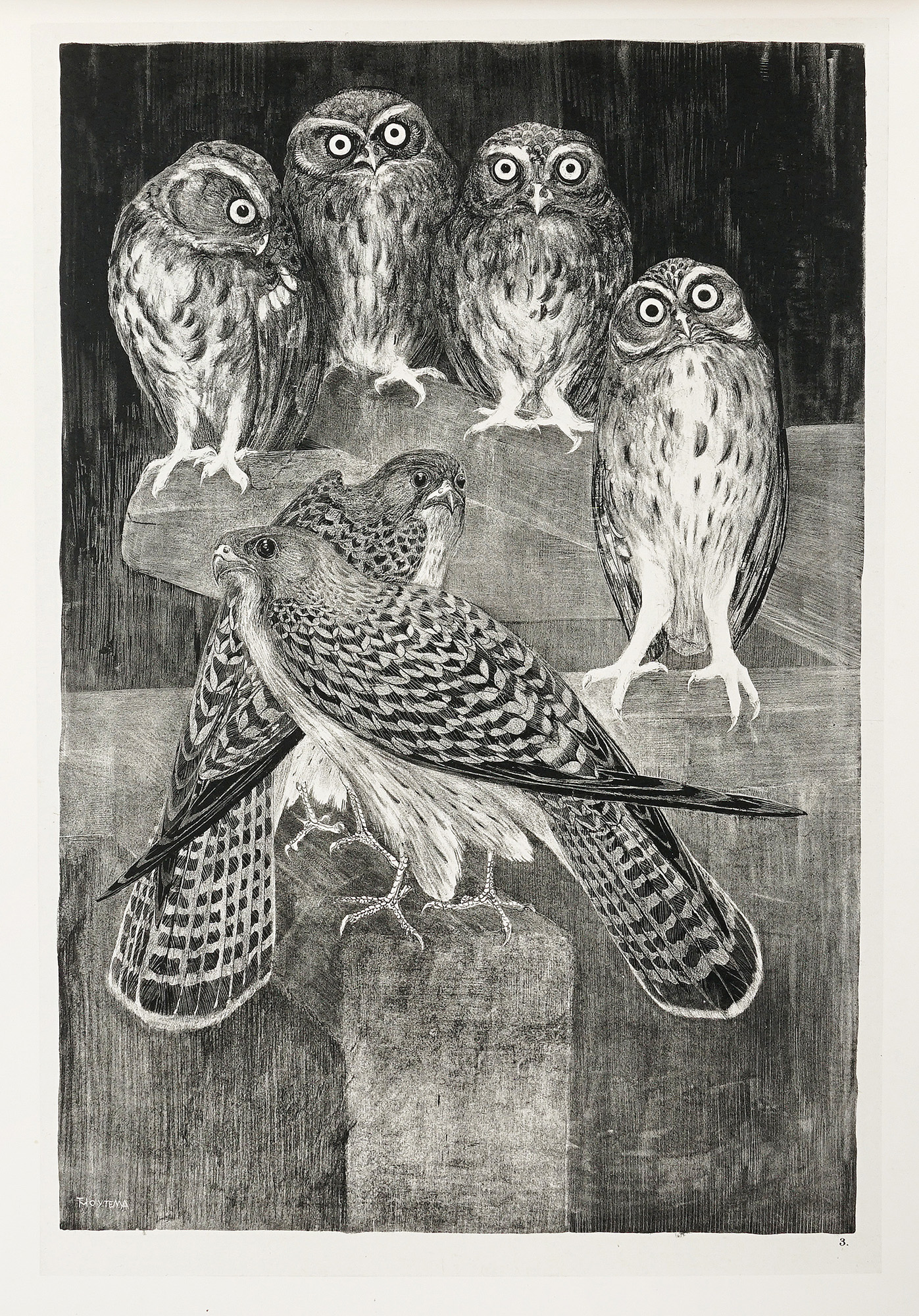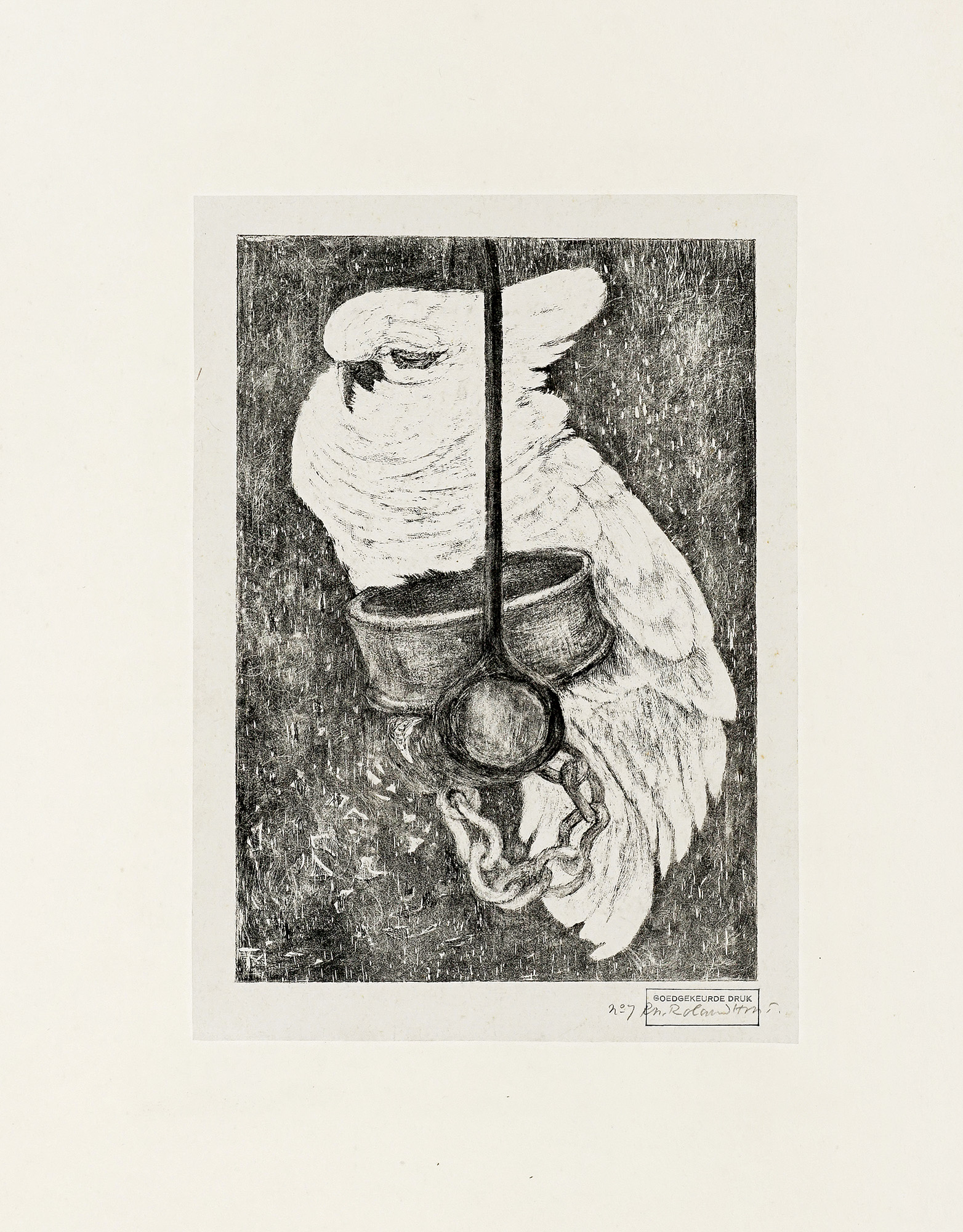 1) Vier steenuilen en twee torenvalken (Quattro piccoli gufi e due gheppi). 1898. Litografia su carta applicata. mm 445x300. Foglio: mm 615x470. Firma in lastra in basso a sinistra. "3." a stampa in basso a destra. 2) Witte kakatoe aan ketting op stok (Cacatua bianco su bastone con catena). post 1917. Litografia su carta applicata. mm 200x140. Foglio: mm 525x395. Siglata in lastra in basso a sinistra. Timbro ad inchiostro "GOEDGEKEURDE DRUK" con numerazione e firma a matita di Roland Holst. Es. n. 7. (2) OPERA 1: Ottima conservazione. OPERA 2: Minimi difetti, altrimenti ottima conservazione.