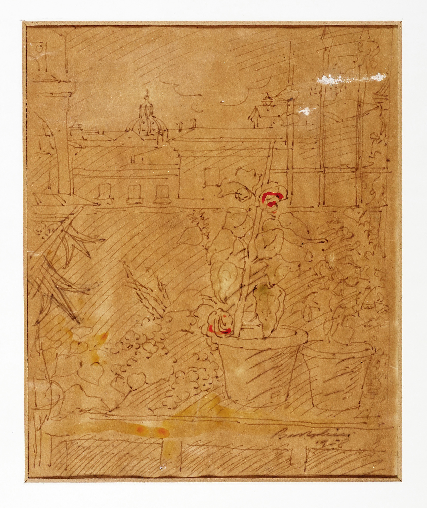 Penna, inchiostro di china e tracce di colore bianco, arancione e rosso su carta spessa mattone. mm 360x297. Firma e data in basso a destra. (1) Foglio applicato a passe-partout. Buona conservazione.