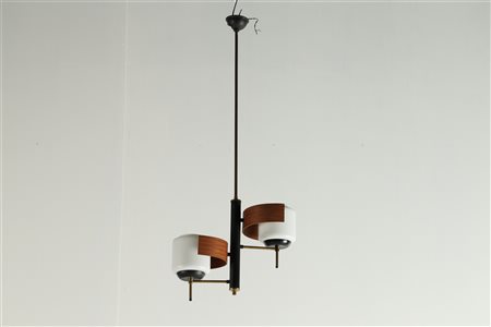 MANIFATTURA DEL XX SECOLO Lampadario a due luci. Acciaio e vetro. Cm 95,00. Parti in teak.