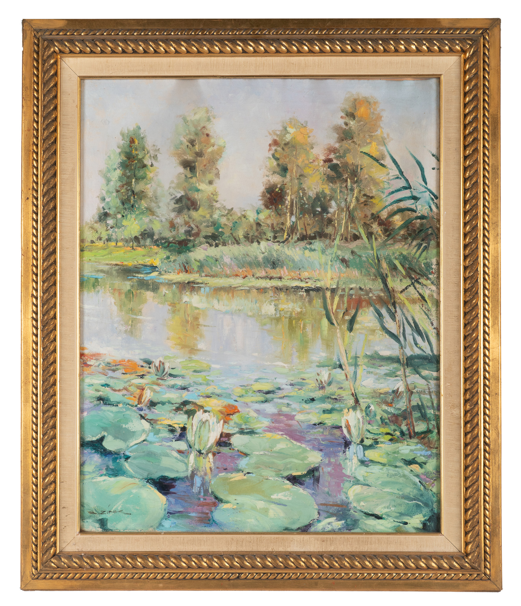 Rudi Zink, Lago con fiori di loto. Olio su cartone telato. cm 67,5x54....
