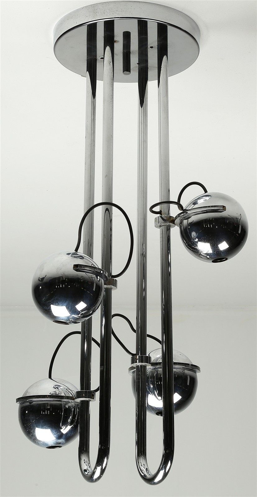 MANIFATTURA ITALIANA XX SECOLO Lampada a sospensione. Metallo cromato. Cm 40,00 x 90,00 x 40,00. Anni '70.