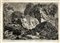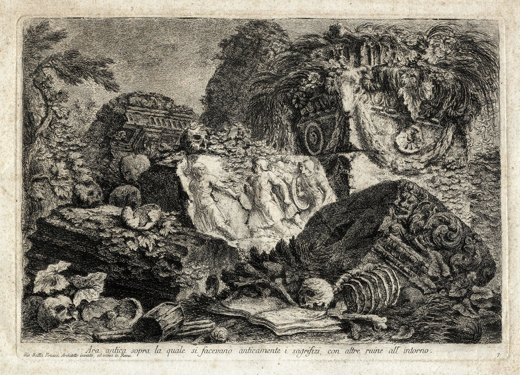 Giovanni Battista Piranesi, Ara antica sopra la quale si facevano anticamente i sacrifizi, con altre ruine all'intorno. 1743-1744 [II edizione, IV uscita 1760 ca.-1835]. Acquaforte, bulino e raschietto. mm 245x347. Foglio: mm 332x445. Focillon, 16. Wilton-Ely, 19. Robison, 18. Ficacci, 18. Con la firma al margine sinistro in basso, il numero "7" all'angolo inferiore destro nella didascalia. Da Prima parte di architetture e prospettive inventate ed incise da Gio. Batta Piranesi architetto veneziano dedicate al sig. Nicola Giobbe, opera composta da frontespizio e 12 tavole pubblicata per la prima volta a Roma dai fratelli Pagliarini nel 1743 e di nuovo in Opere varie da Bouchard nel 1750 con due tavole aggiuntive e il titolo cambiato. Buona prova nel III stato di 4 dalla seconda edizione quarta uscita (1760 ca.-1835), su carta vergellata pesante apparentemente priva di filigrana. (1)Acquaforte, bulino e raschietto. mm 245x347. Foglio: mm 332x445. Focillon, 16. Wilton-Ely, 19. Robison, 18. Ficacci, 18. Con la firma al margine sinistro in basso, il numero "7" all'angolo inferiore destro nella didascalia. Da Prima parte di architetture e prospettive inventate ed incise da Gio. Batta Piranesi architetto veneziano dedicate al sig. Nicola Giobbe, opera composta da frontespizio e 12 tavole pubblicata per la prima volta a Roma dai fratelli Pagliarini nel 1743 e di nuovo in Opere varie da Bouchard nel 1750 con due tavole aggiuntive e il titolo cambiato. Buona prova nel III stato di 4 dalla seconda edizione quarta uscita (1760 ca.-1835), su carta vergellata pesante apparentemente priva di filigrana. (1) Foglio integro con margini come in origine. Traccia di piega verticale al centro. Ingiallimento da esposizione e fioriture localizzate alle estremità. Segni d'uso.