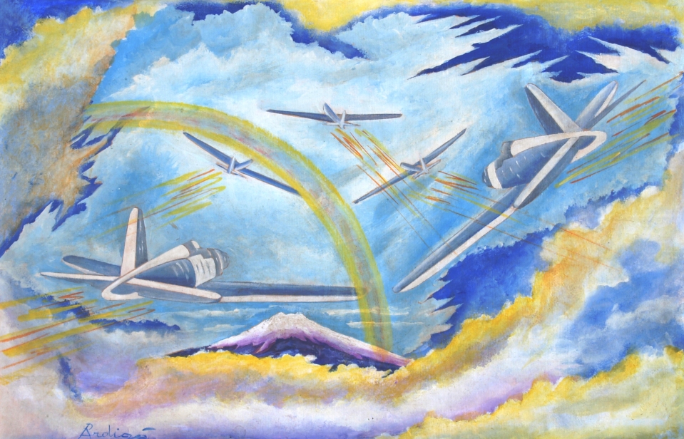 "Aerei tra le nuvole futuriste" Olio su carte povera cm. H: 13.00 L: 20.00 Firma in basso a destra. Opera esposta alla Galleria d'Arte moderna "La Civetta (Ostia)" in occasione della mostra: "Futuristi e guerra futurista" dal '20 al '40. Certificato descrittivo dell'opera rilasciato dalla Galleria "La Civetta (Ostia)".