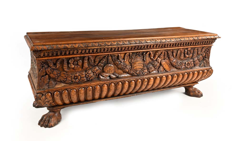 Cassapanca rinascimentale in noce, XVII secolo cm 68x180x57 facciata decorata da uno stemma affiancato da festoni intagliati sospesi e trattenuti da un nastro pieghettato; profilo inferiore baccellato, piedi ferini