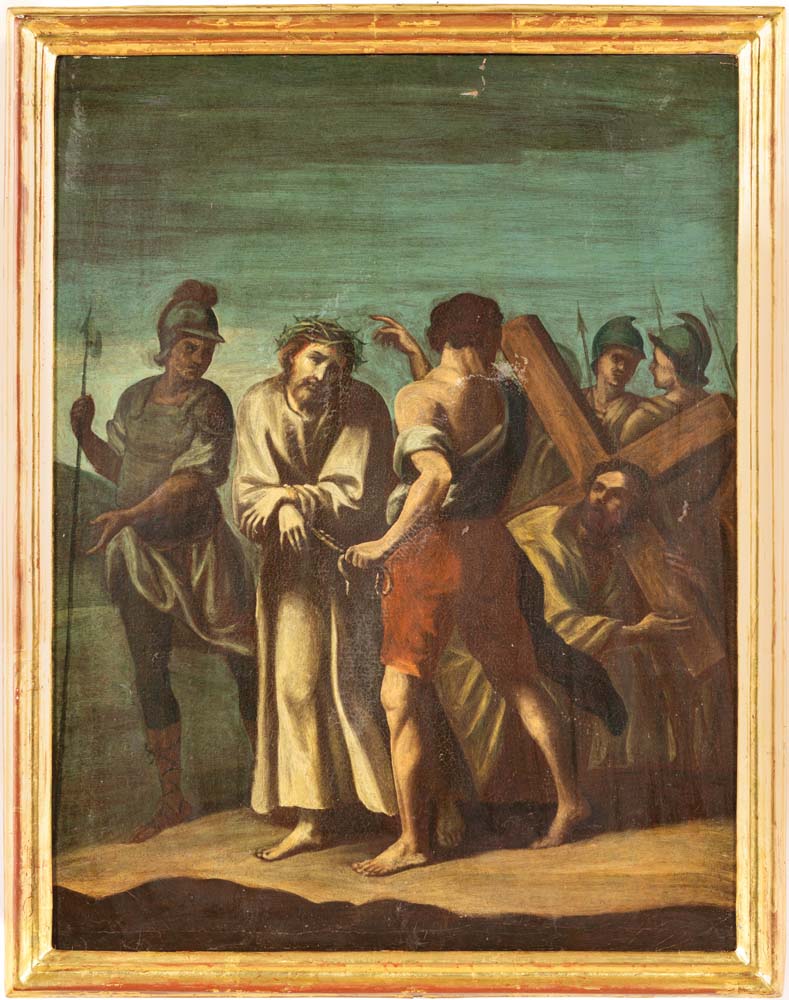 Pittore Napoletano del XVIII secolo Cristo nella sua Passione olio su tela cm 78x60 - con cornice cm 86x68 Simone di Cirene costretto dai soldati romani a portare la croce di Gesù verso il Golgota
