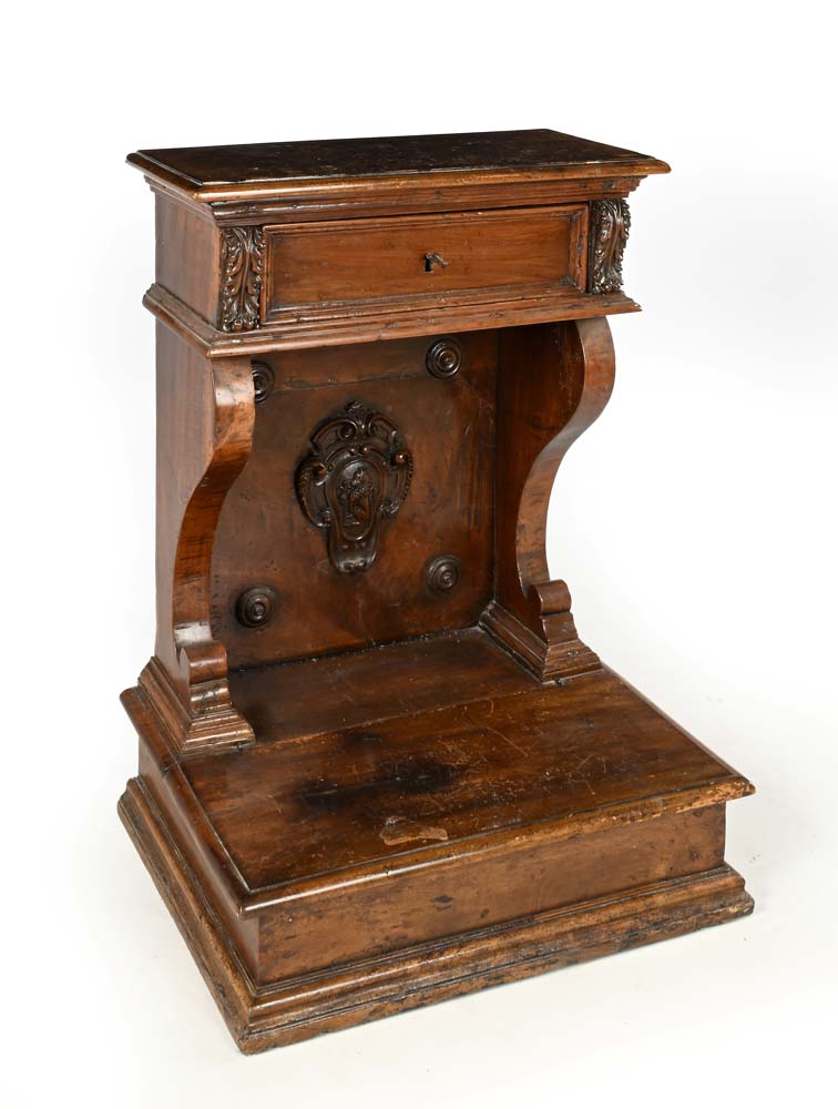 Inginocchiatoio in noce, XVII/XVIII secolo cm 86x64x48 caratterizzato da uno stemma araldico intagliato in rilievo; un cassetto nella parte superiore, piano inferiore apribile, pannello posteriore rivestito in similpelle. Difetti e restauri