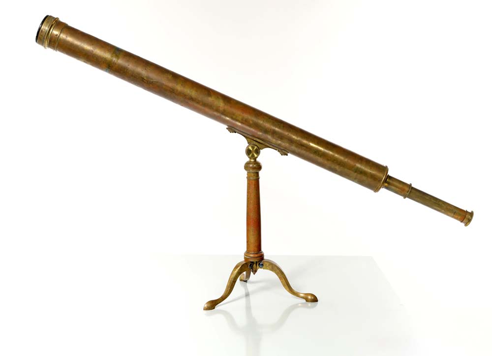 Telescopio a rifrazione in ottone con treppiede da tavolo e cassa in noce cm 117 - cassa cm 12x103x21 dotato di oculari intercambiabili, compreso il filtro per l’osservazione del Sole; regolazione della messa a fuoco mediante manopola a vite e cremagliera. Innesto al supporto verticale (tipo impero), mediante cilindro e fissaggio con vite manuale; regolazione all’attacco sia del movimento zenitale che equatoriale, mediante due comandi manuali a vite senza fine e cremagliere circolari (una verticale ed una orizzontale). I tre piedi sono apribili per essere incernierati allo stelo centrale e si richiudono per essere riposti sulla scatola originale, in legno di noce Collezione privata, Siena