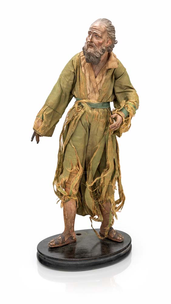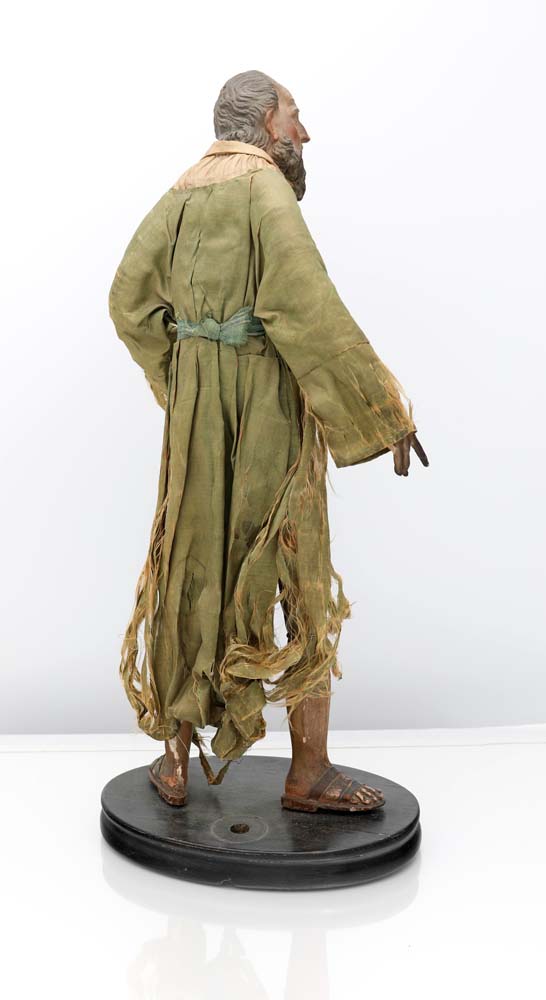 Figura di San Giuseppe, Napoli, inizi del XIX secolo cm 40x18x12,5 costruito secondo la tradizione dei pastori da presepe napoletano con testa modellata in terracotta, arti in legno, corpo in filo di ferro rivestito in stoppa; il volto con folta barba e bocca socchiusa con denti visibili. Lievi difetti e vestitura logora