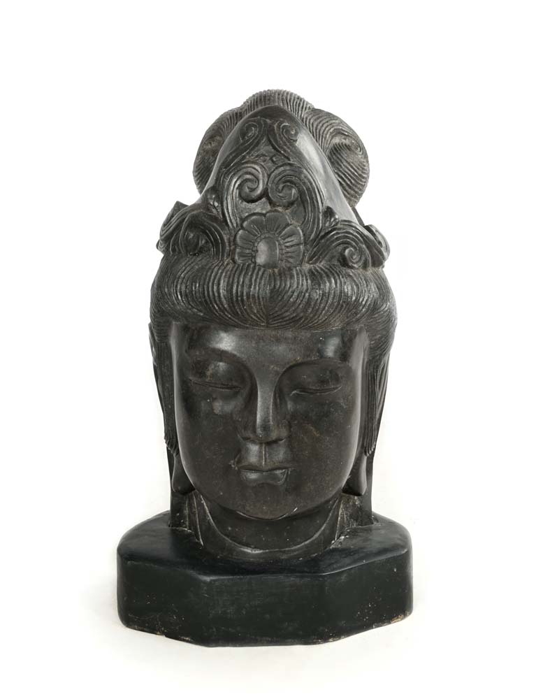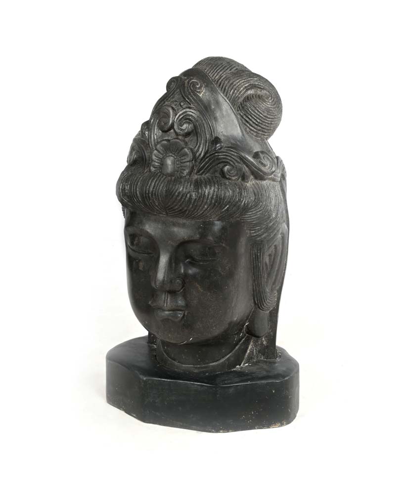 Grande testa di Guan Yin in pietra nera, Cina, XIX secolo altezza cm 60 testa finemente scolpita, con capelli raccolti in un'elaborata acconciatura con fiore centrale e riccioli contrapposti