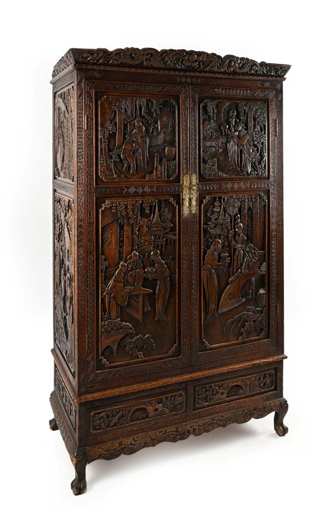 Armadio a due ante in legno intagliato, Cina, Repubblica, XX secolo cm 190x110x57 interamente decorato con scene di genere in bassorilievo racchiuse entro formelle; le ante celano ripiani a creare cinque vani in colonna disposti a sinistra e quattro a destra con due cassetti; fascia inferiore similmente decorata suddivisa in due cassetti allineati, piedi sagomati