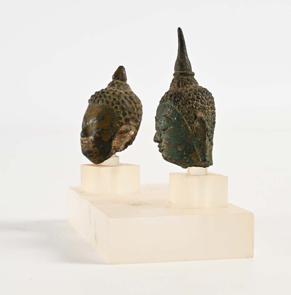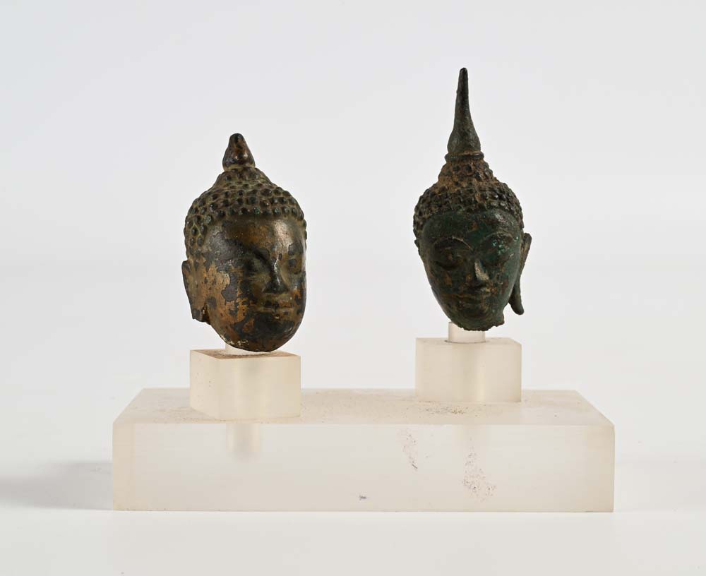 Due testine di Buddha in bronzo altezza cm 5 e cm 6 - l'insieme cm 10x10,5x6...