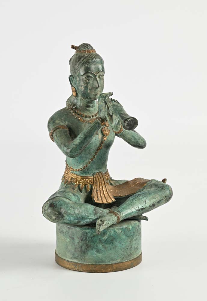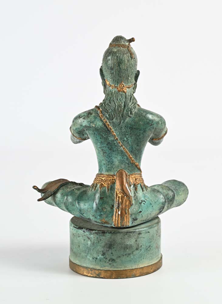 Scultura in bronzo a patina verde, XX secolo cm 23x17x12 raffigurante un suonatore di flauto ritratto a gambe incrociate