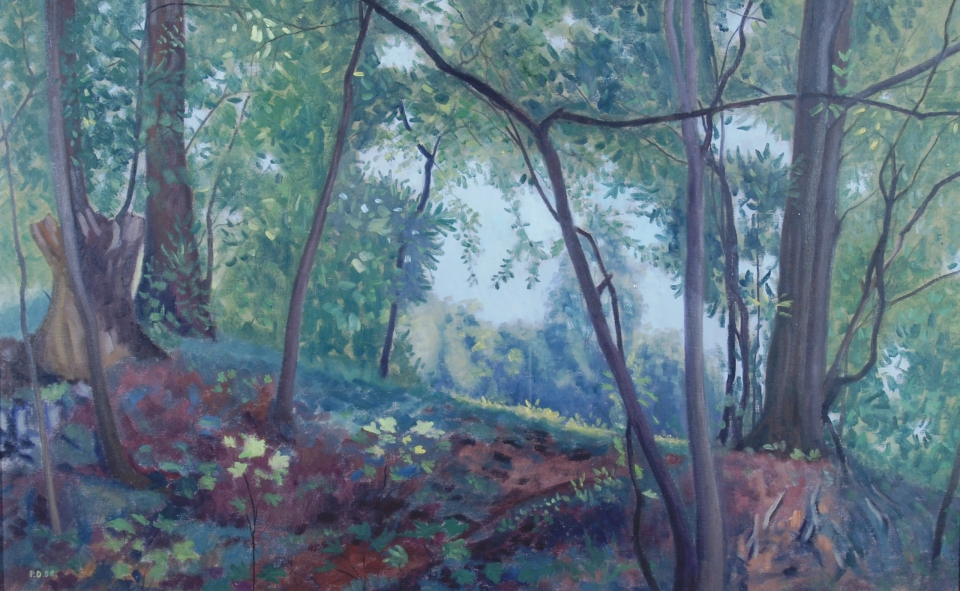 "Bosco a Trarego" 1988 Olio su tela cm. H: 50.00 L: 80.00 Sigla in basso a sinistra. Pubblicato su: Piero Dudreville, paesaggi e nature morte recenti" Galleria d'Arte Ciovasso (Milano), dicembre 1988 - gennaio 1999.